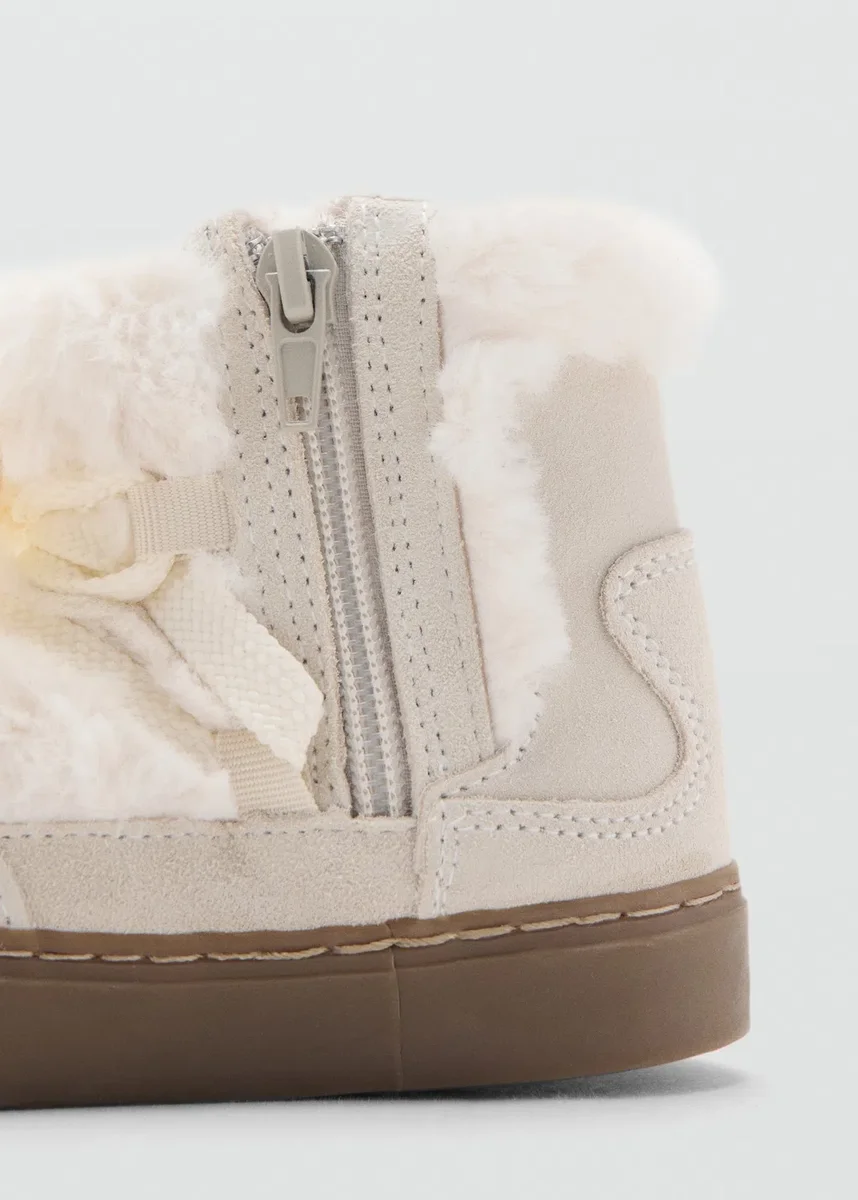 Skóra bydlęca. Materiał futrzany. Wzór śnieżny. Okrągły nosek. Gumowa podeszwa. Zapięcie na pętelkę. Boczne zapięcie na zamek błyskawiczny.