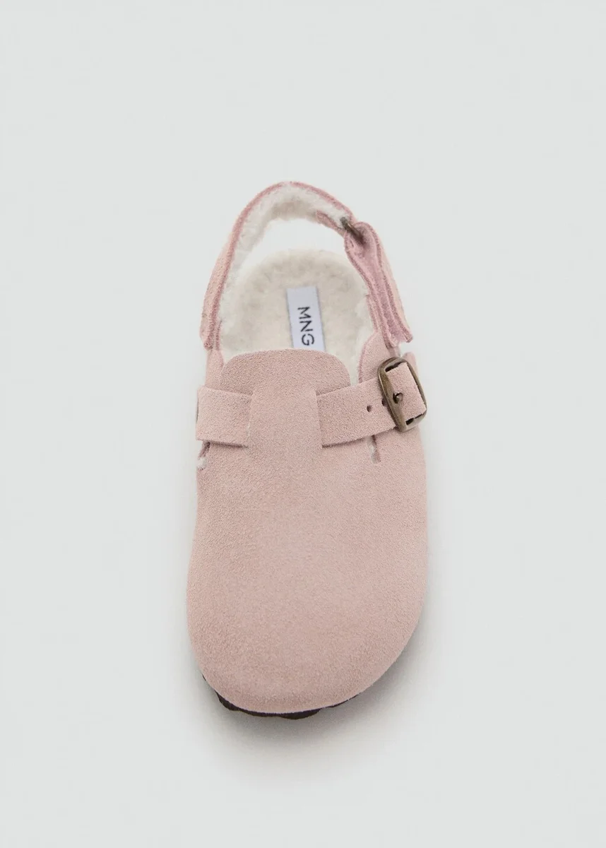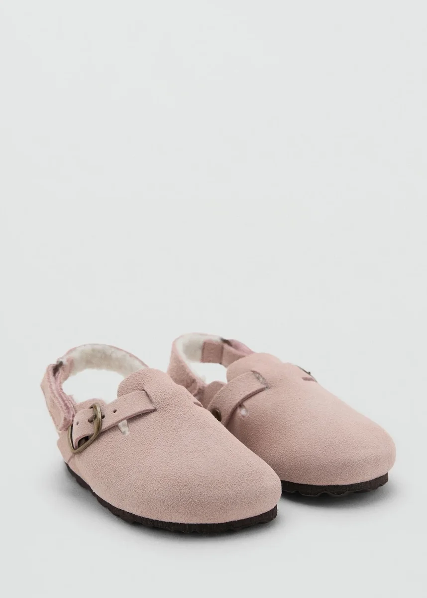 Skóra bydlęca. Styl chodaków. Okrągły nosek. Wnętrze z imitacji owczej skóry. Rozcięcie z tyłu. Ozdobna klamra. Zapięcie na rzep.