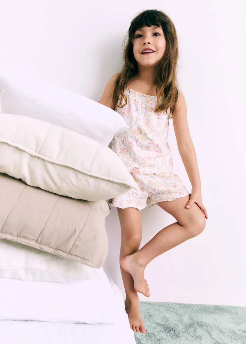 100% bawełna. Prosty krój. Krótki krój. Nadrukowany wzór. Kwiatowy nadruk. Okrągły dekolt. Bez rękawów. Cienkie ramiączka. Elastyczny pas. Marszczone detale