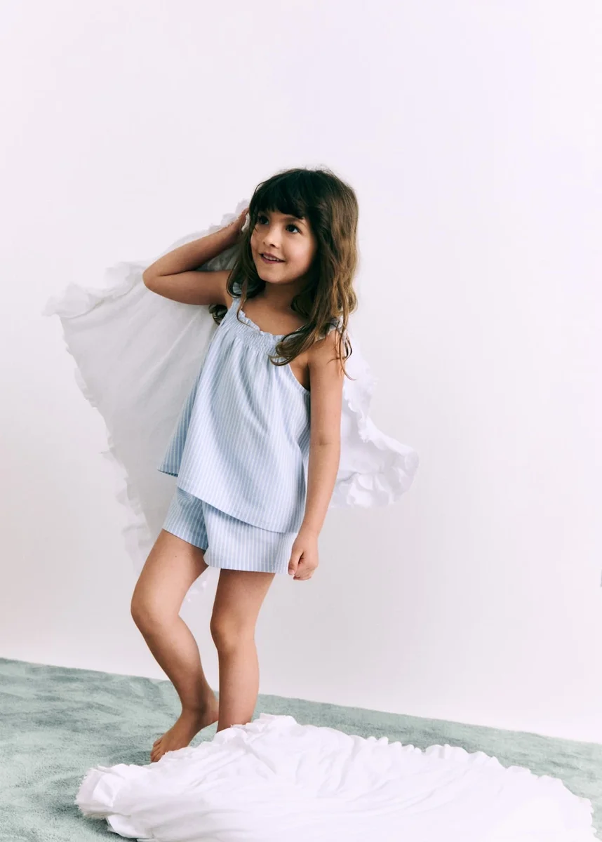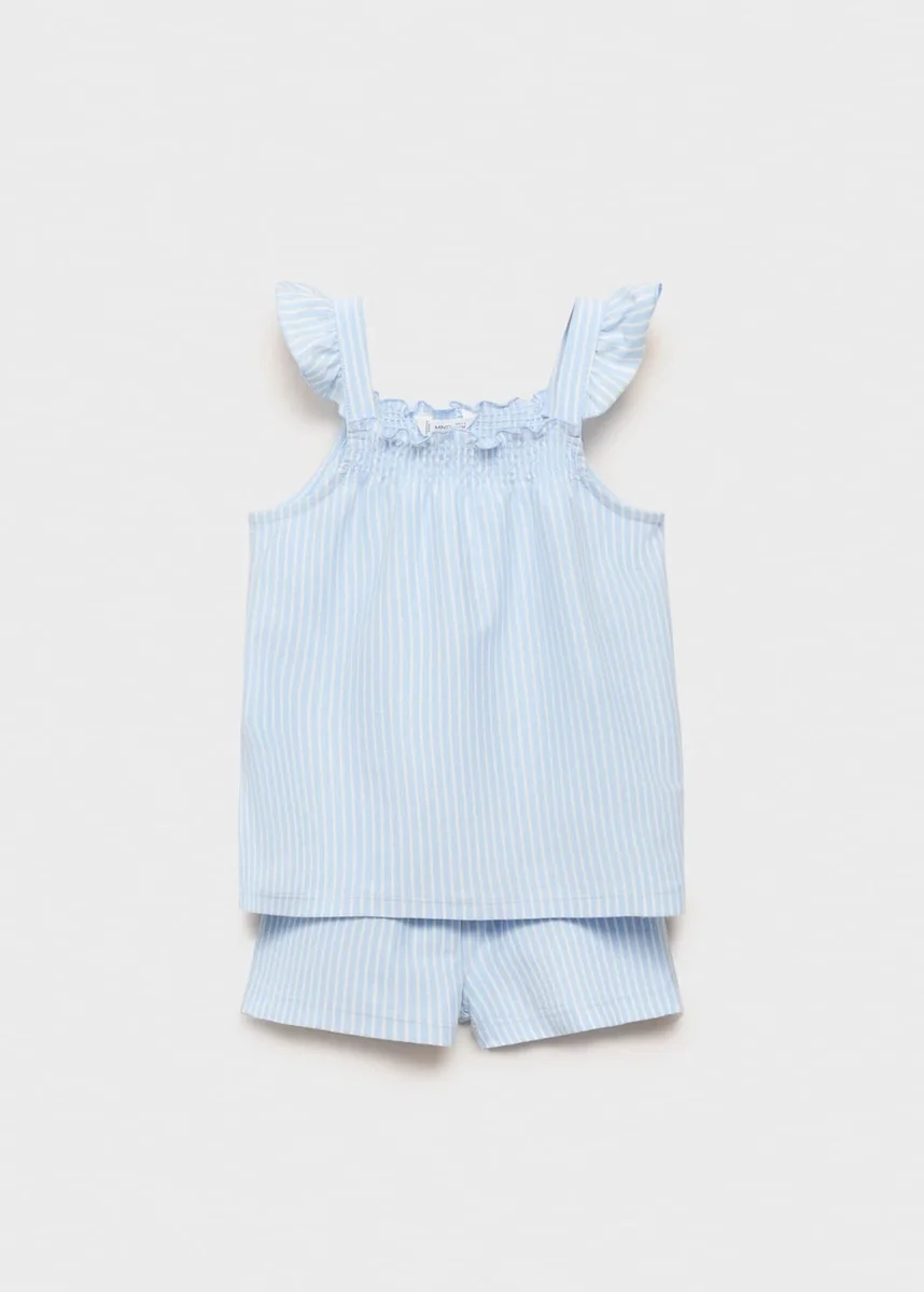 100% bawełna. Prosty krój. Krótki fason. Paski. Falbanki na ramionach. Kwadratowy dekolt. Bez rękawów. Elastyczny pas. Marszczone wykończenie