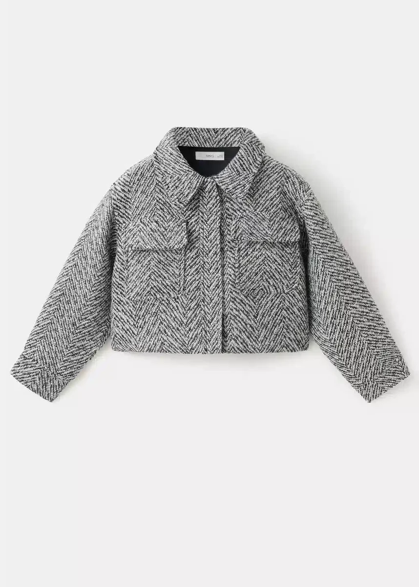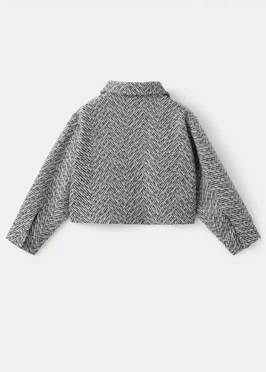 Tkanina tweedowa. Dzianina w jodełkę. Tkanina lureksowa. Prosty krój. Kołnierzyk koszulowy. Długie rękawy. Dwie kieszenie z przodu. Zapięcie na zamek błyskawiczny. Całkowity wygląd