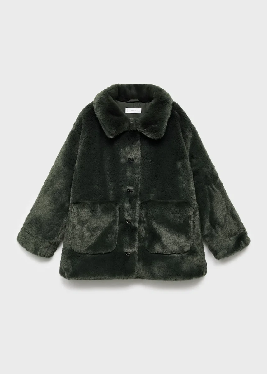 Materiał futrzany. Prosty krój. Kołnierzyk koszulowy. Zapięcie na guziki z przodu. Długi rękaw. Dwie naszywane kieszenie z przodu. Z podszewką. Kolekcja świąteczna.
