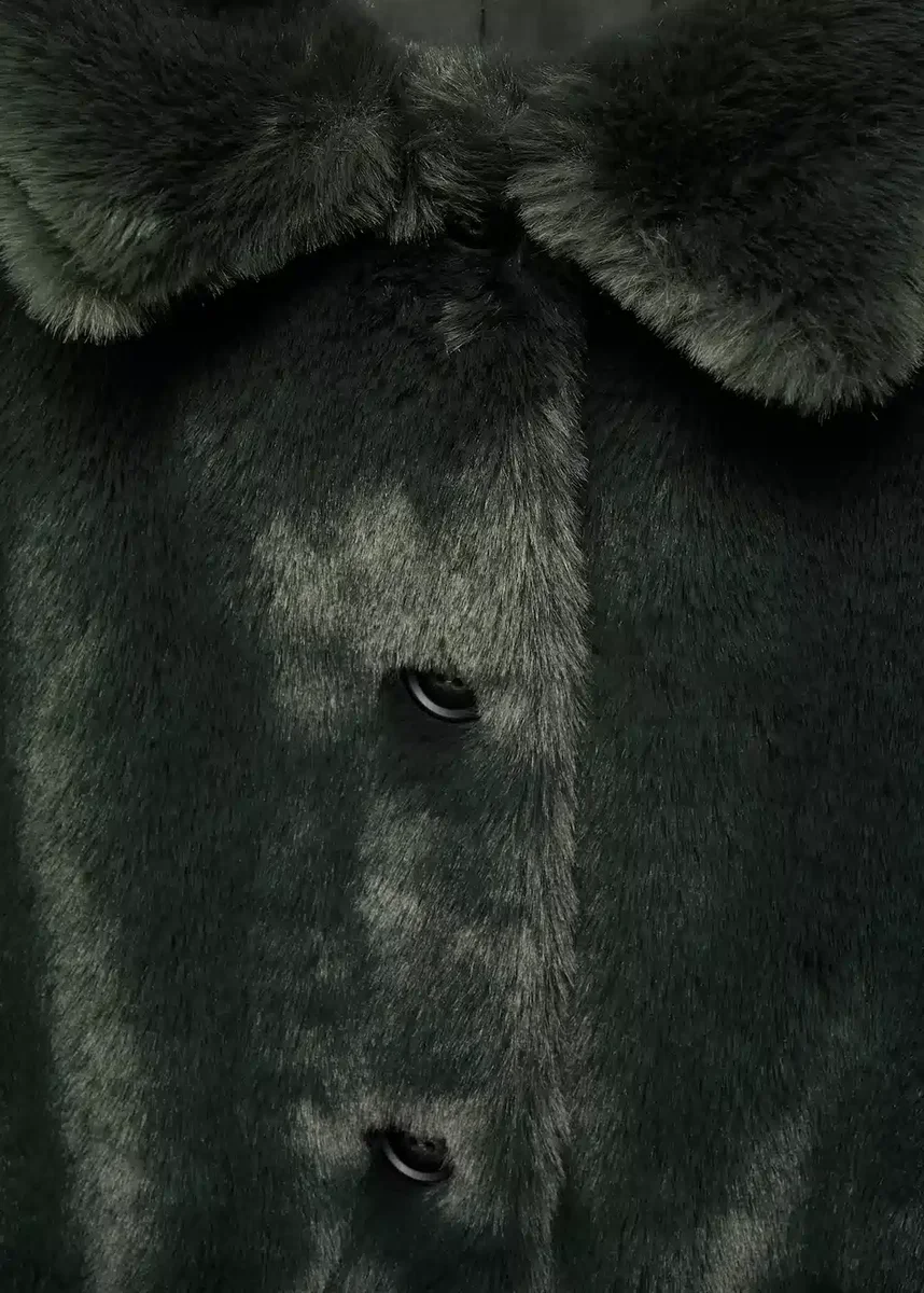 Materiał futrzany. Prosty krój. Kołnierzyk koszulowy. Zapięcie na guziki z przodu. Długi rękaw. Dwie naszywane kieszenie z przodu. Z podszewką wewnętrzną. Kolekcja świąteczna