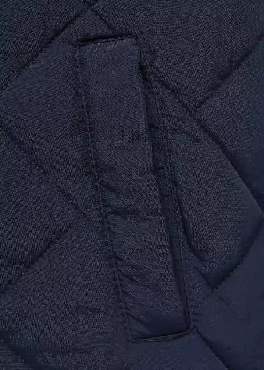 Pikowana tkanina. Wzór rombów. Długi fason. Z kapturem. Długie rękawy. Zapięcie na zatrzaski. Dwie kieszenie boczne