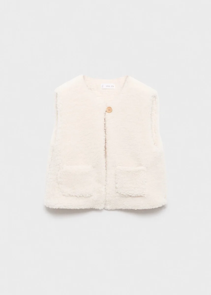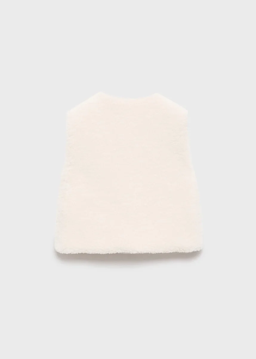 Tkanina imitująca owczą skórę. Prosty krój. Dekolt w szpic. Bez rękawów. Dwie naszywane kieszenie z przodu. Zapięcie na guziki z przodu. Etykieta na dane osobowe. Powrót do szkoły.