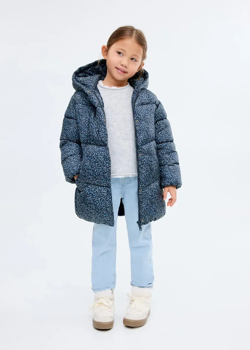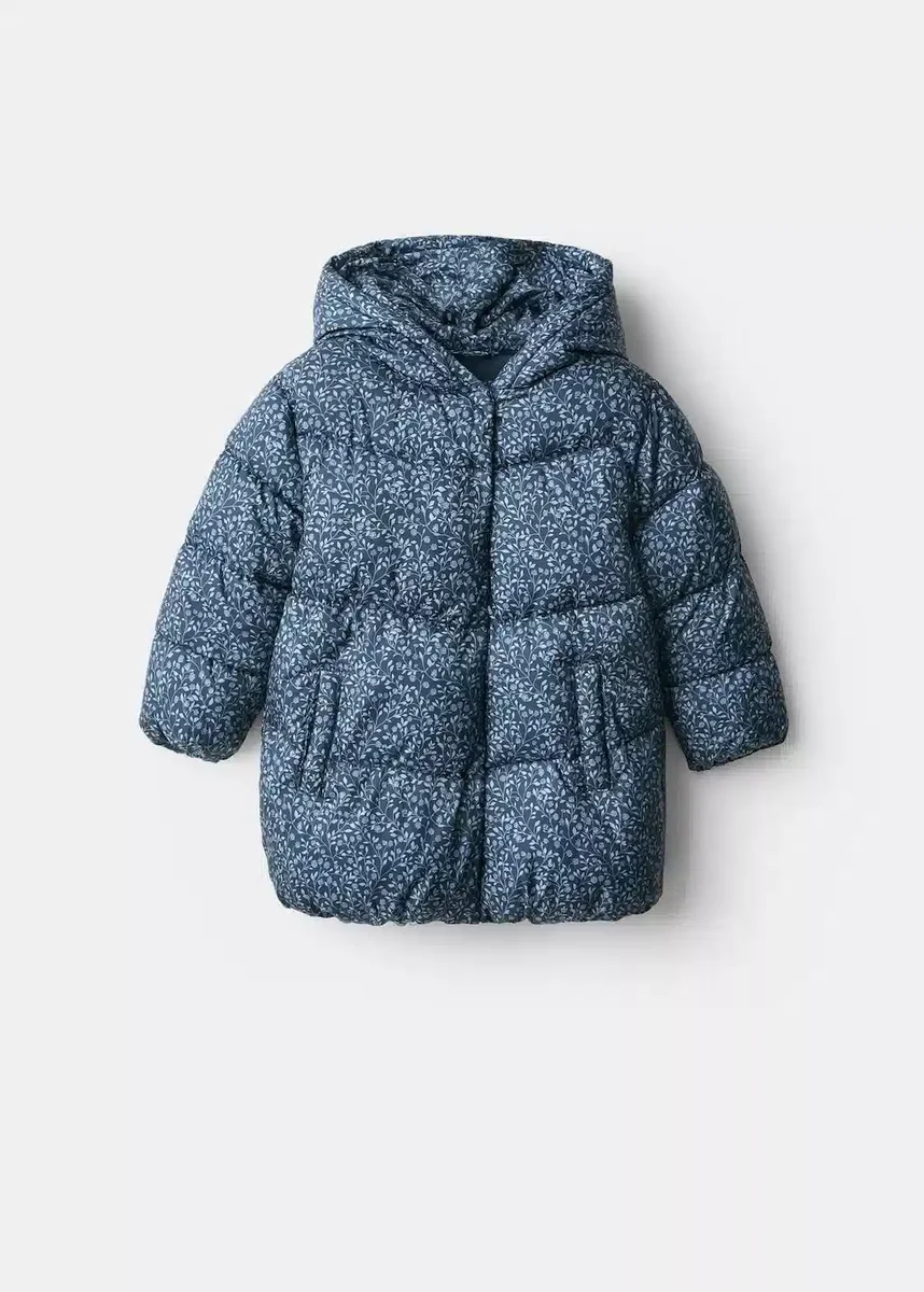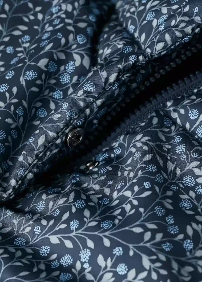 Pikowana tkanina. Prosty krój. Kwiatowy wzór. Długi krój. Z kapturem. Długie rękawy. Zapięcie z przodu na zamek błyskawiczny i guziki. Dwie kieszenie boczne. Z podszewką wewnętrzną