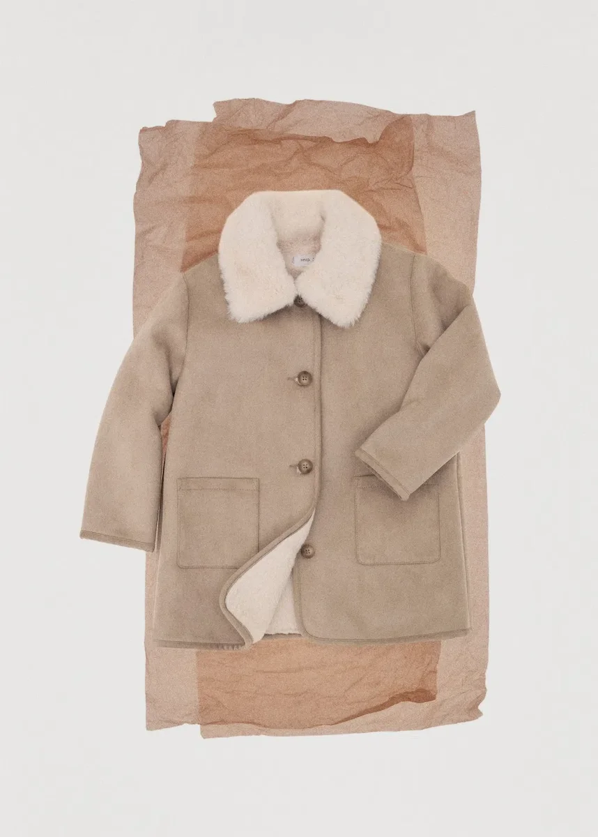 Tkanina poliestrowa. Sztuczna zamszowa skóra. Podszewka z efektem futra. Prosty krój. Średnia długość. Kołnierzyk koszulowy z efektem futra. Długie rękawy. Zapięcie na guziki z przodu. Dwie naszywane kieszenie z przodu. Kolekcja świąteczna.