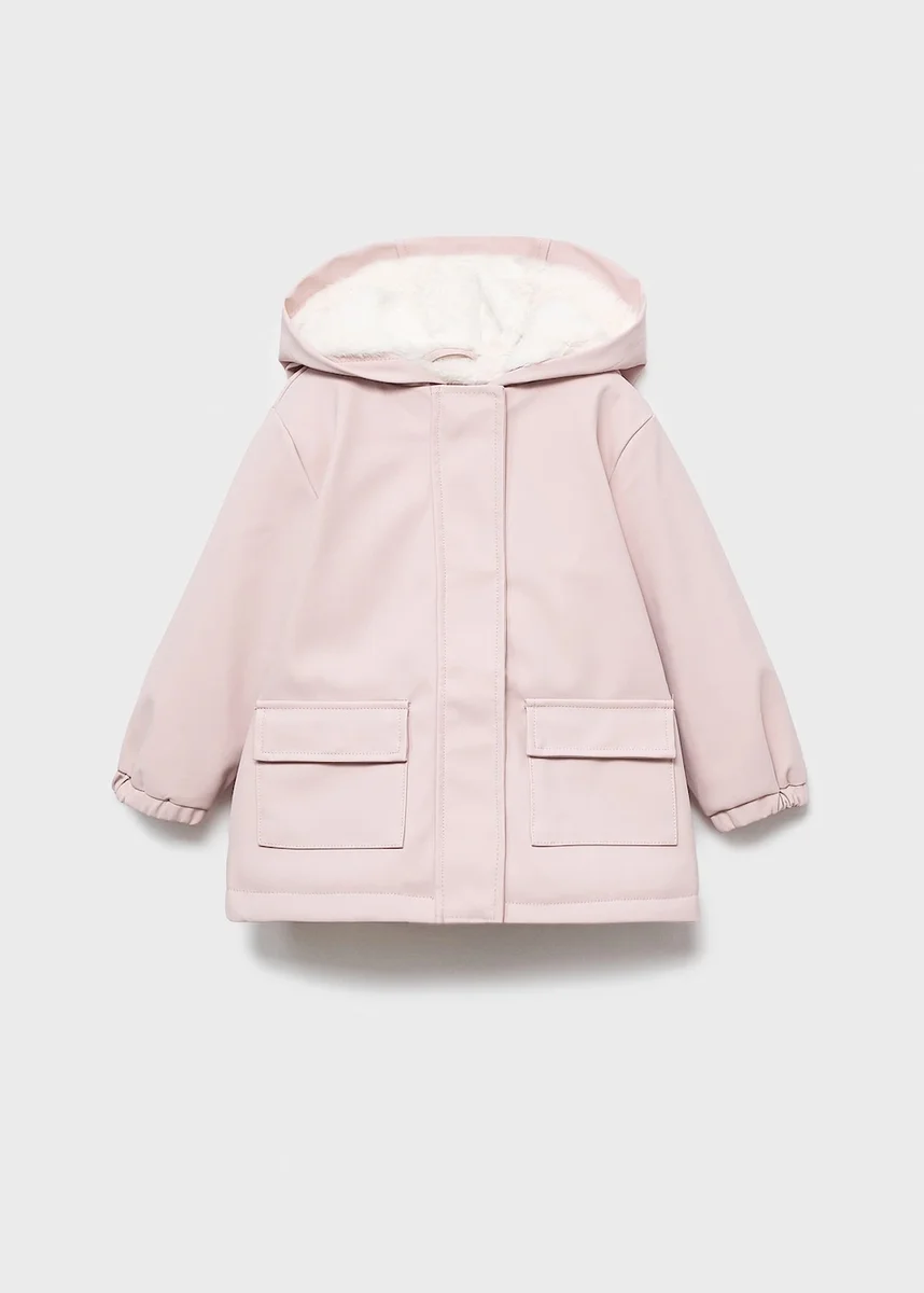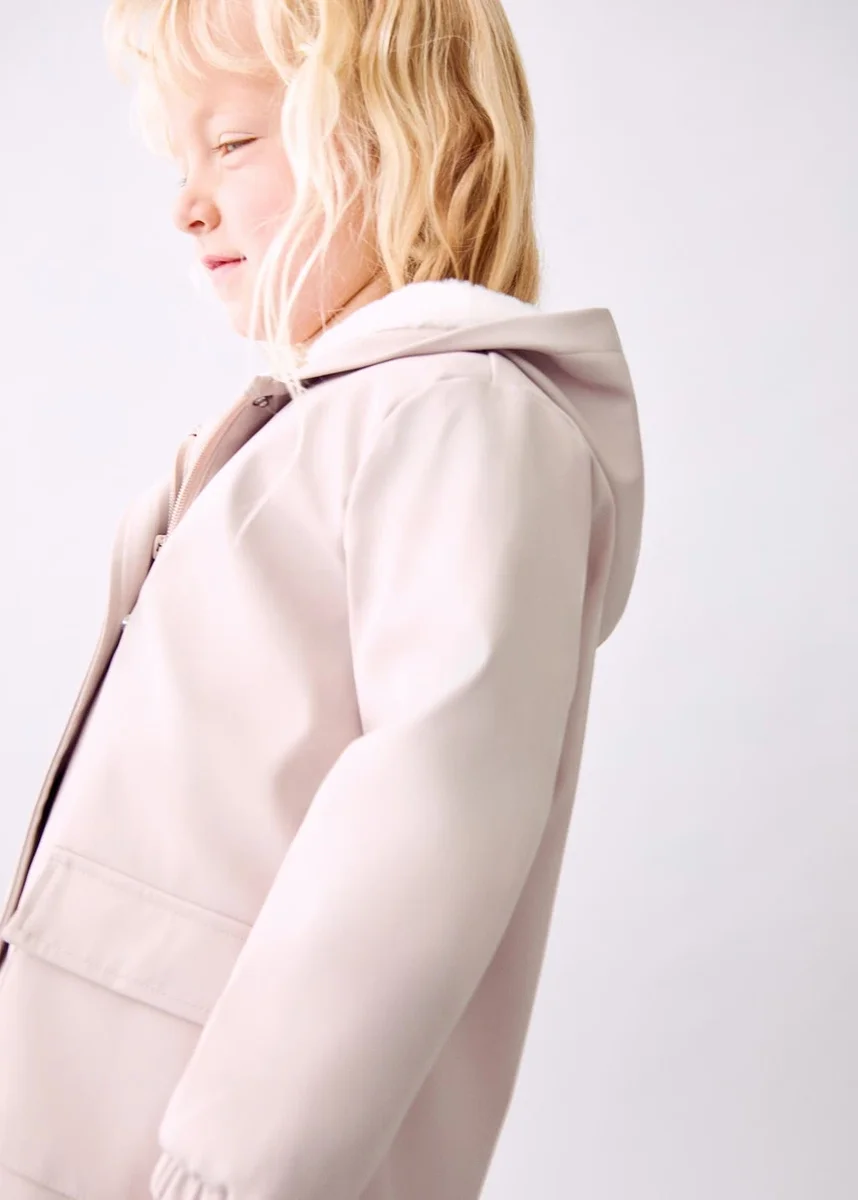 Materiał futrzany. Materiał wodoodporny. Długość midi. Prosty krój. Z kapturem. Długie rękawy. Zapięcie na zamek błyskawiczny i guziki. Dwie naszywane kieszenie z przodu. Podszewka imitująca futro