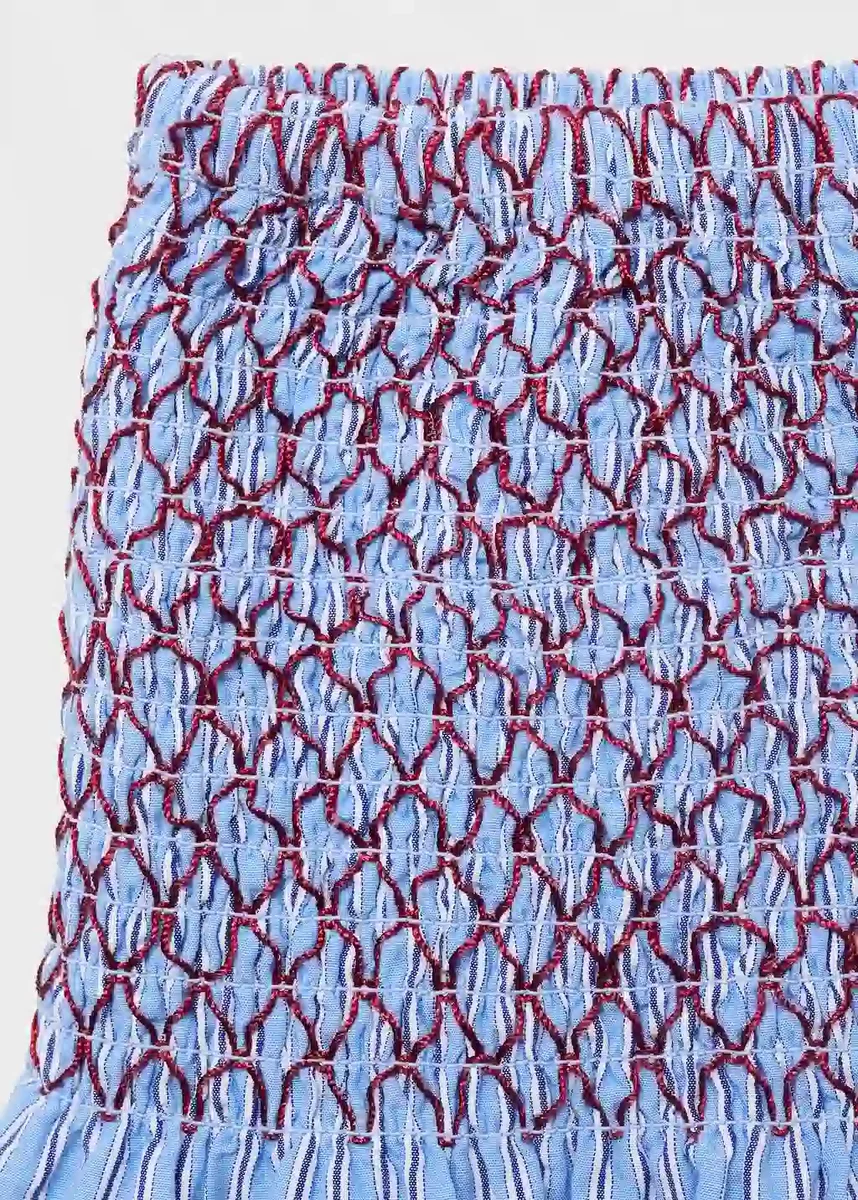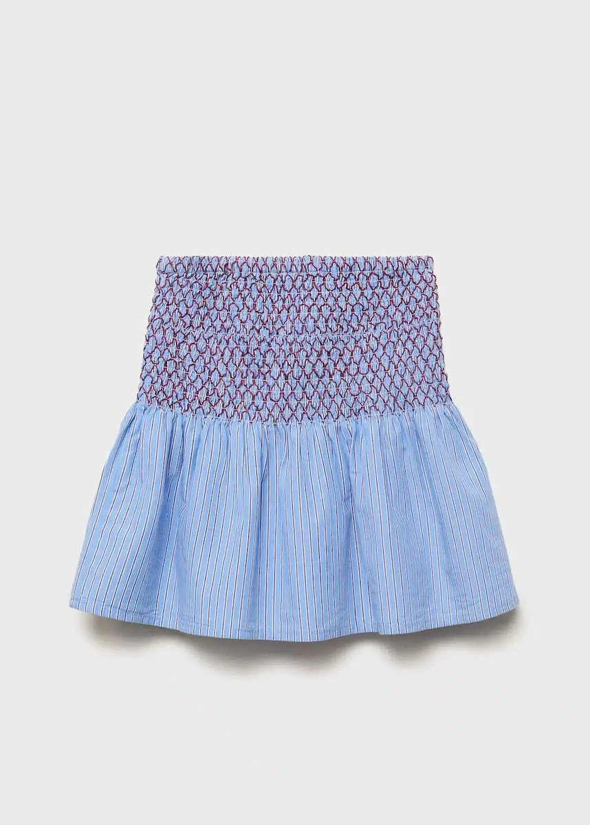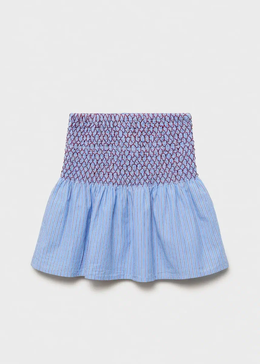 Ta spódnica wykonana z bawełnianej tkaniny ma wzór w paski i nie posiada zapięcia. Jej krój w kształcie litery A uzupełnia elastyczny pas w kształcie plastra miodu i haftowane detale, idealne do stworzenia kompletnego looku.