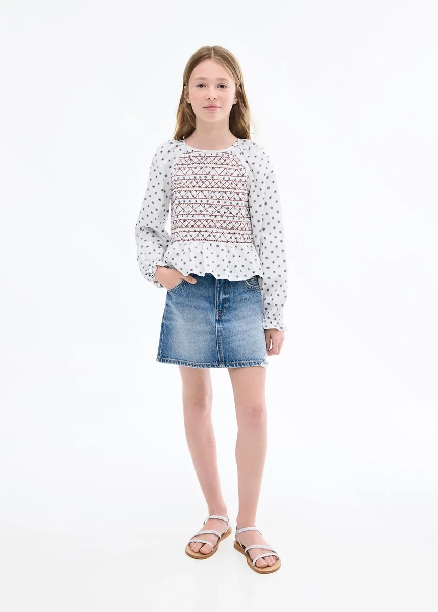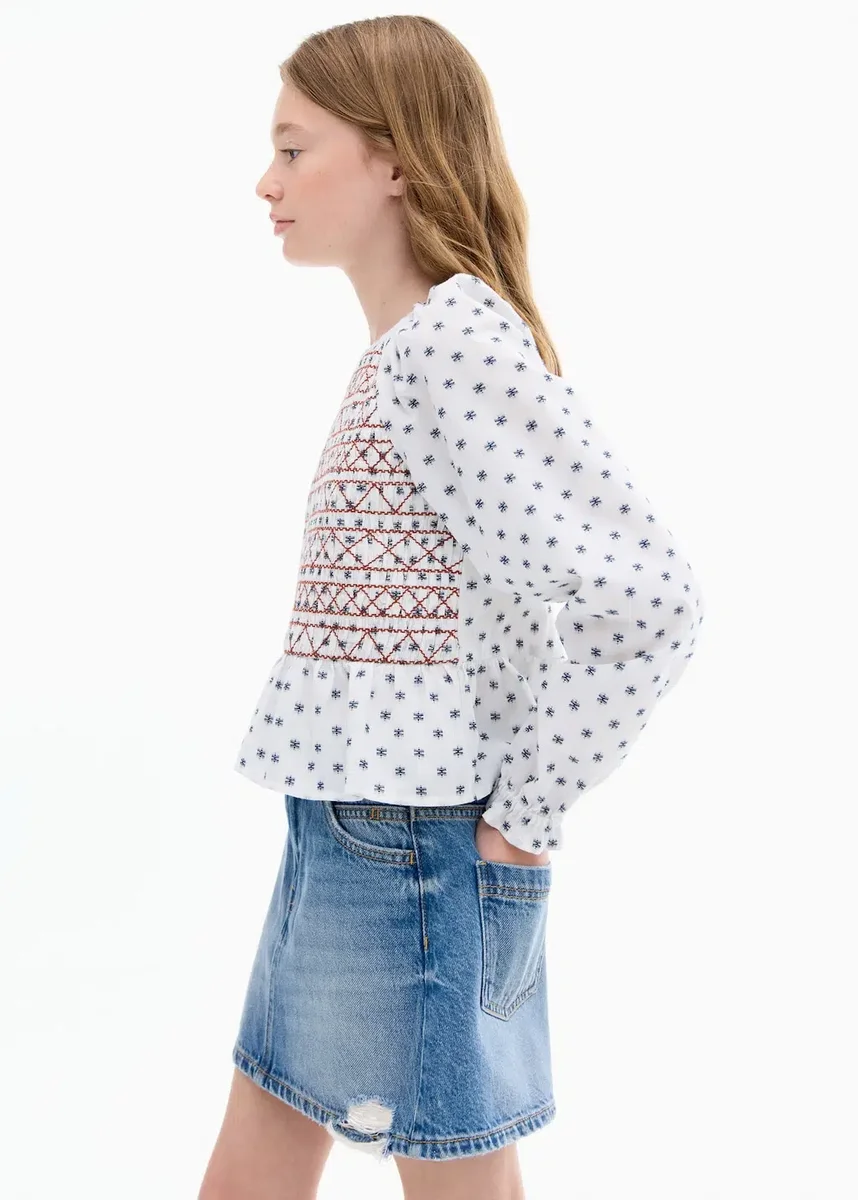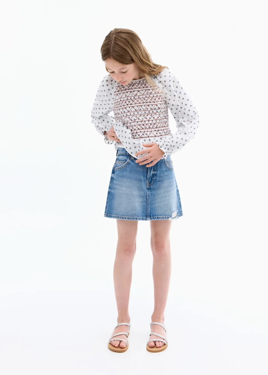 100% bawełna. Tkanina dżinsowa. Krótki fason. Sylwetka w kształcie litery A. Regularna wysokość talii. Szlufki. Zapięcie na guziki i zamek błyskawiczny. Kieszeń na monety. Dwie kieszenie boczne. Ozdobne przetarcia.