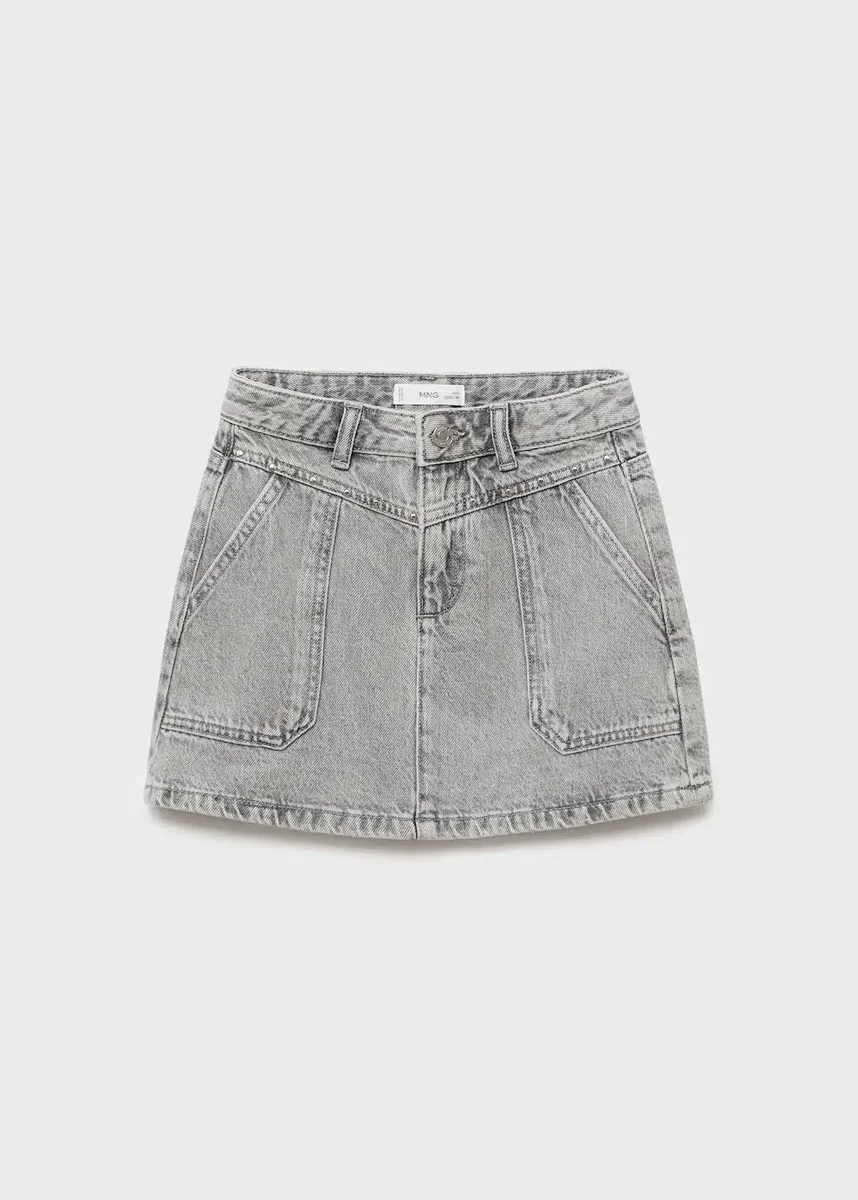 Ta spódnica, wykonana w 100% z bawełnianego denimu, ma prosty i krótki krój. Posiada szlufki, zapięcie na zamek błyskawiczny i guzik, dwie kieszenie boczne oraz dwie naszywane kieszenie z tyłu.