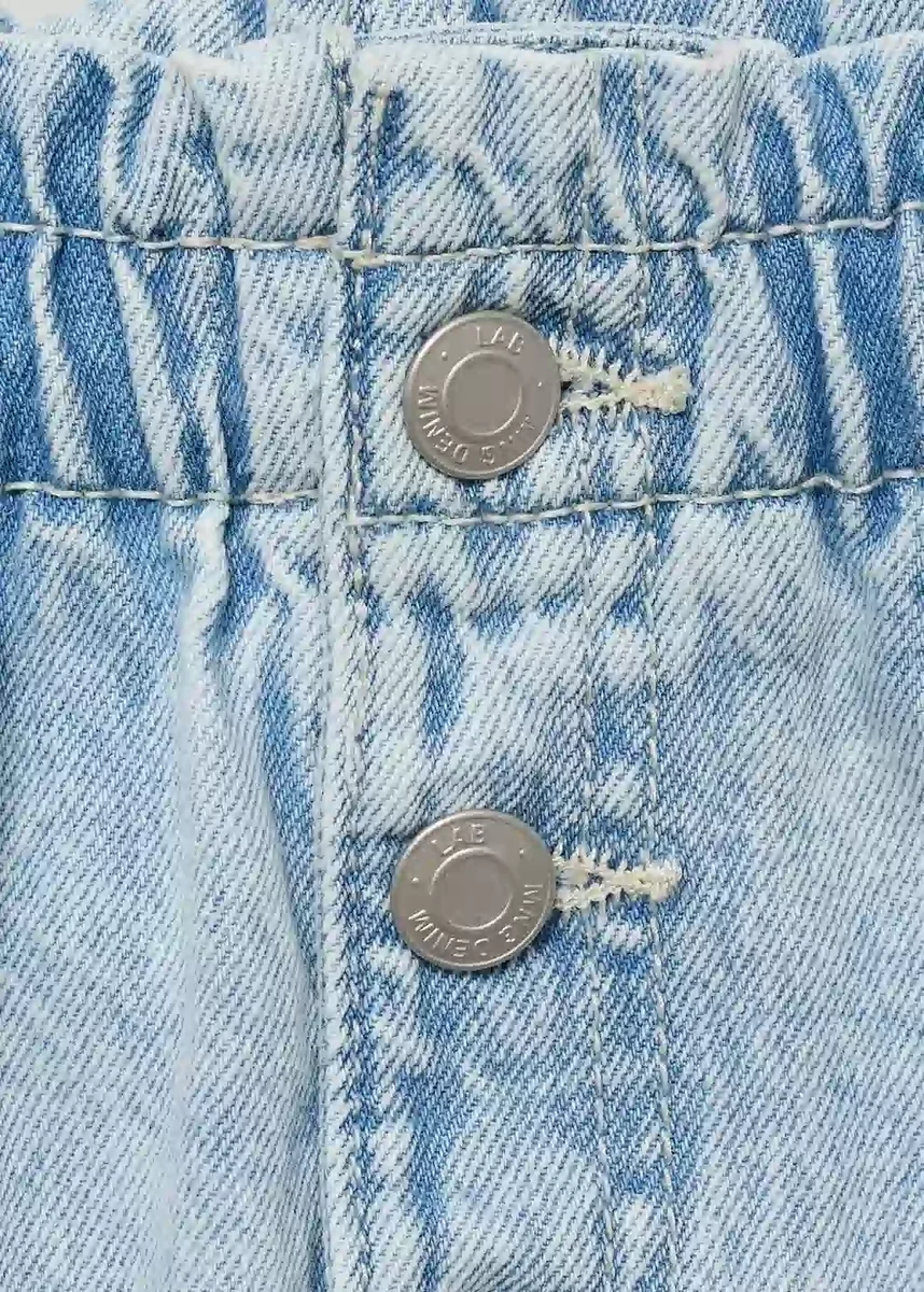 100% bawełna. Bawełniana tkanina dżinsowa. Prosty krój. Krótka długość. Szlufki. Zapięcie na guziki z przodu. Kieszeń na monety. Dwie kieszenie boczne. Naszywane kieszenie z tyłu