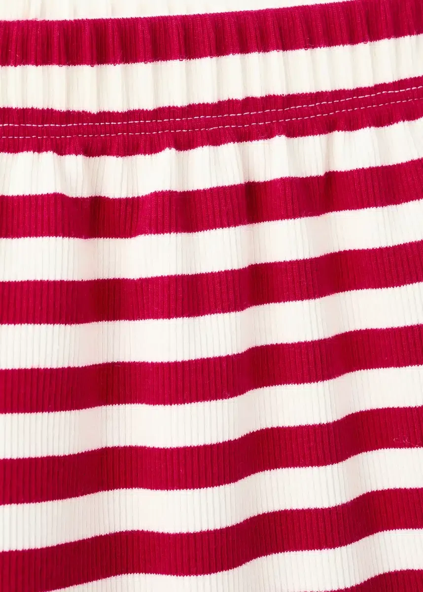 Tkanina bawełniana. Dzianina prążkowana. Krótki fason. W paski. Elastyczny pas. Całkowity wygląd