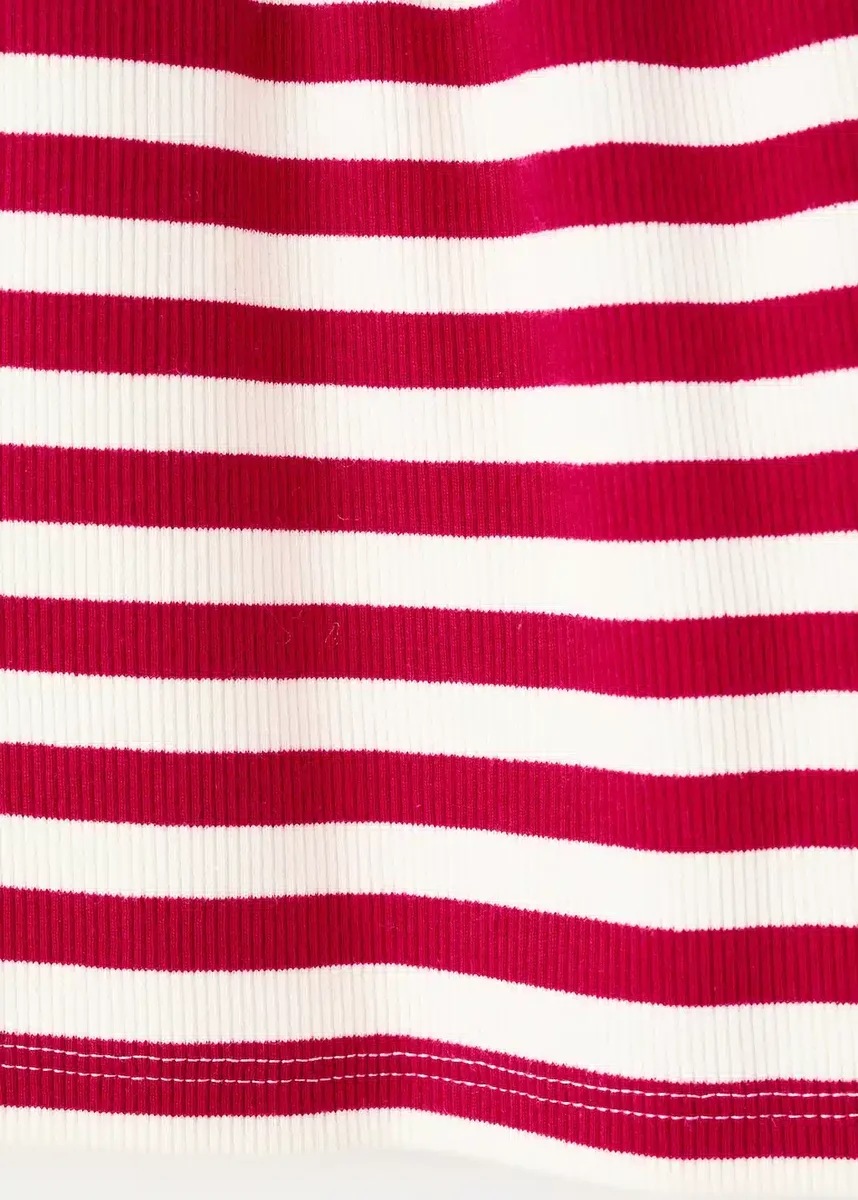 Tkanina bawełniana. Dzianina prążkowana. Krótki krój. Prążkowany wzór. Elastyczny pas. Całościowy wygląd.