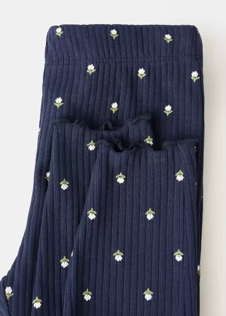Dzianina prążkowana. Tkanina bawełniana. Materiał elastyczny. Kwiatowy wzór. Legginsy. Elastyczny pas. Sprzedawane w zestawie. Dostępny zestaw. Całkowity wygląd. Powrót do szkoły. Czarny piątek