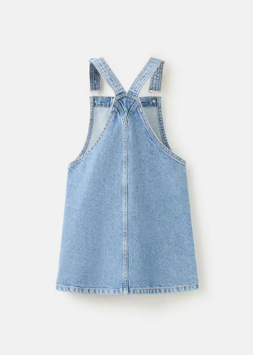 Długi fason. Płaska struktura. 100% bawełna. Materiał dżinsowy. Prosty krój. Krótki fason. Ozdobne guziki. Kwadratowy dekolt. Ramiączka zapinane na guziki. Regulowane ramiączka. Zapięcie na guziki z boku.