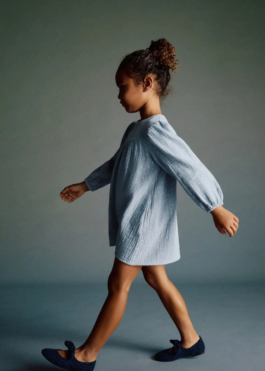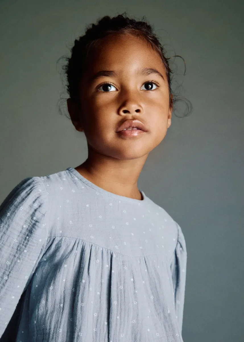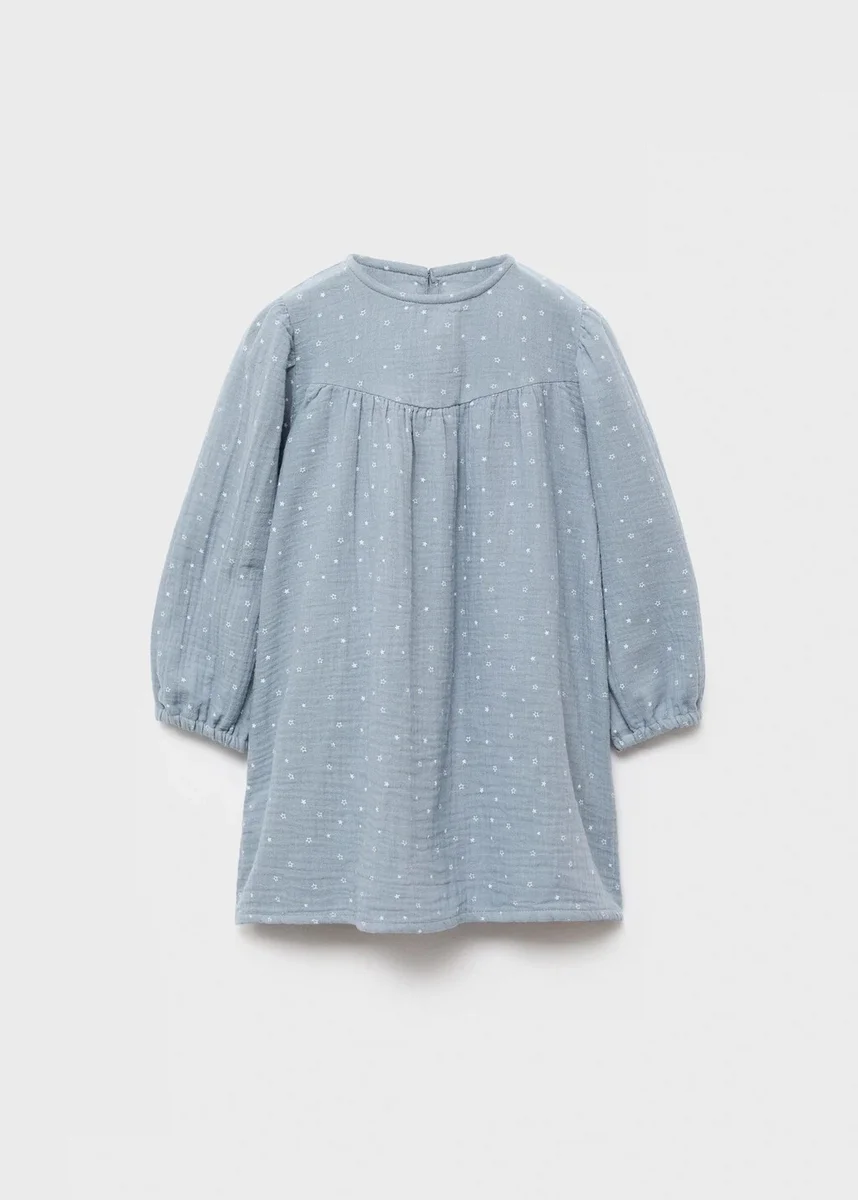 100% bawełna. Tkanina bambula. Długi fason. Nadrukowany wzór. Nadruk w gwiazdki. Okrągły dekolt. Długie rękawy z elastycznymi mankietami. Marszczone wykończenie rękawów. Zapięcie na guziki z tyłu. Czarny piątek