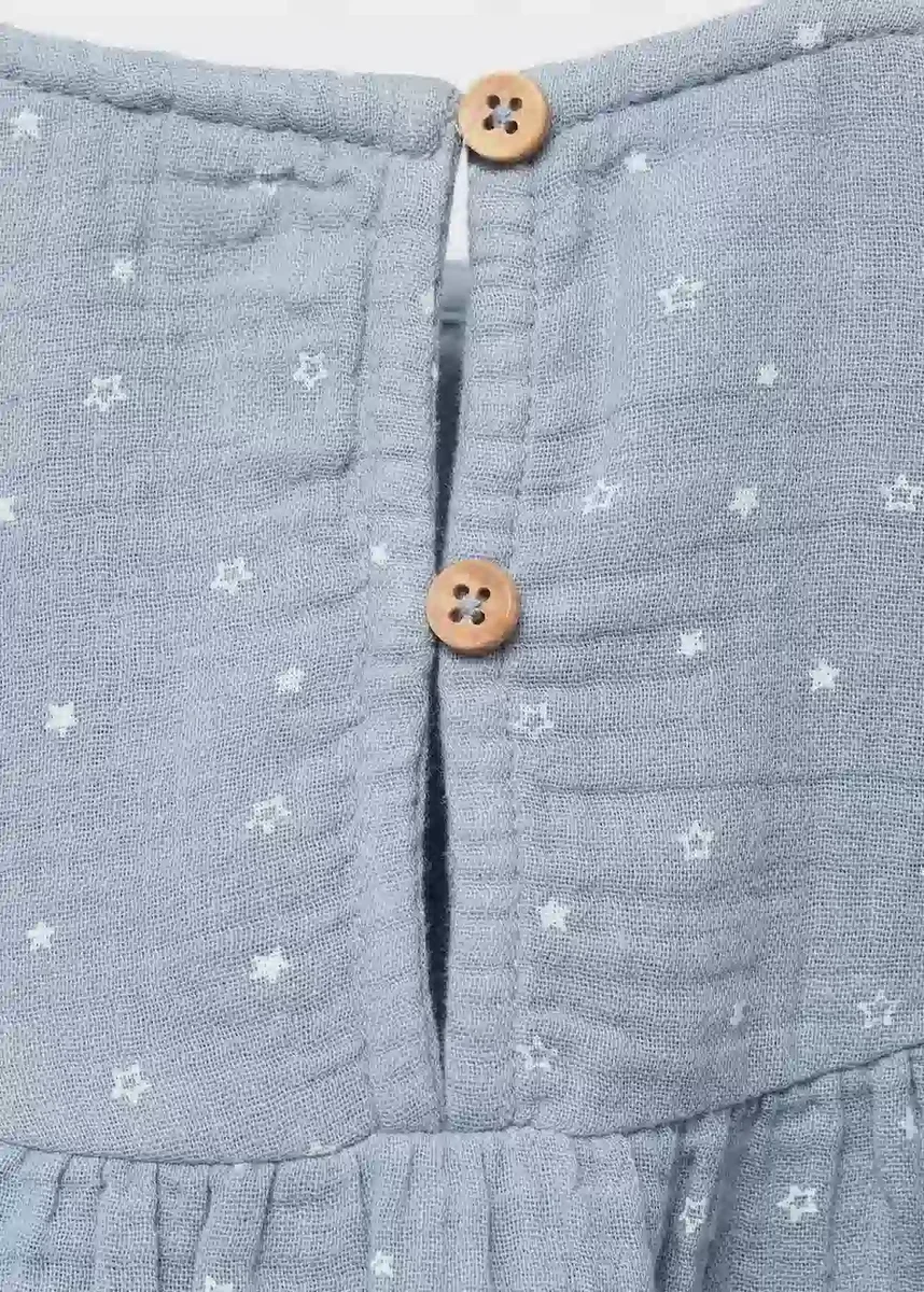100% bawełna. Tkanina bambula. Długi fason. Nadrukowany wzór. Nadruk w gwiazdki. Okrągły dekolt. Długie rękawy z elastycznymi mankietami. Marszczone wykończenie rękawów. Zapięcie na guziki z tyłu. Czarny piątek.