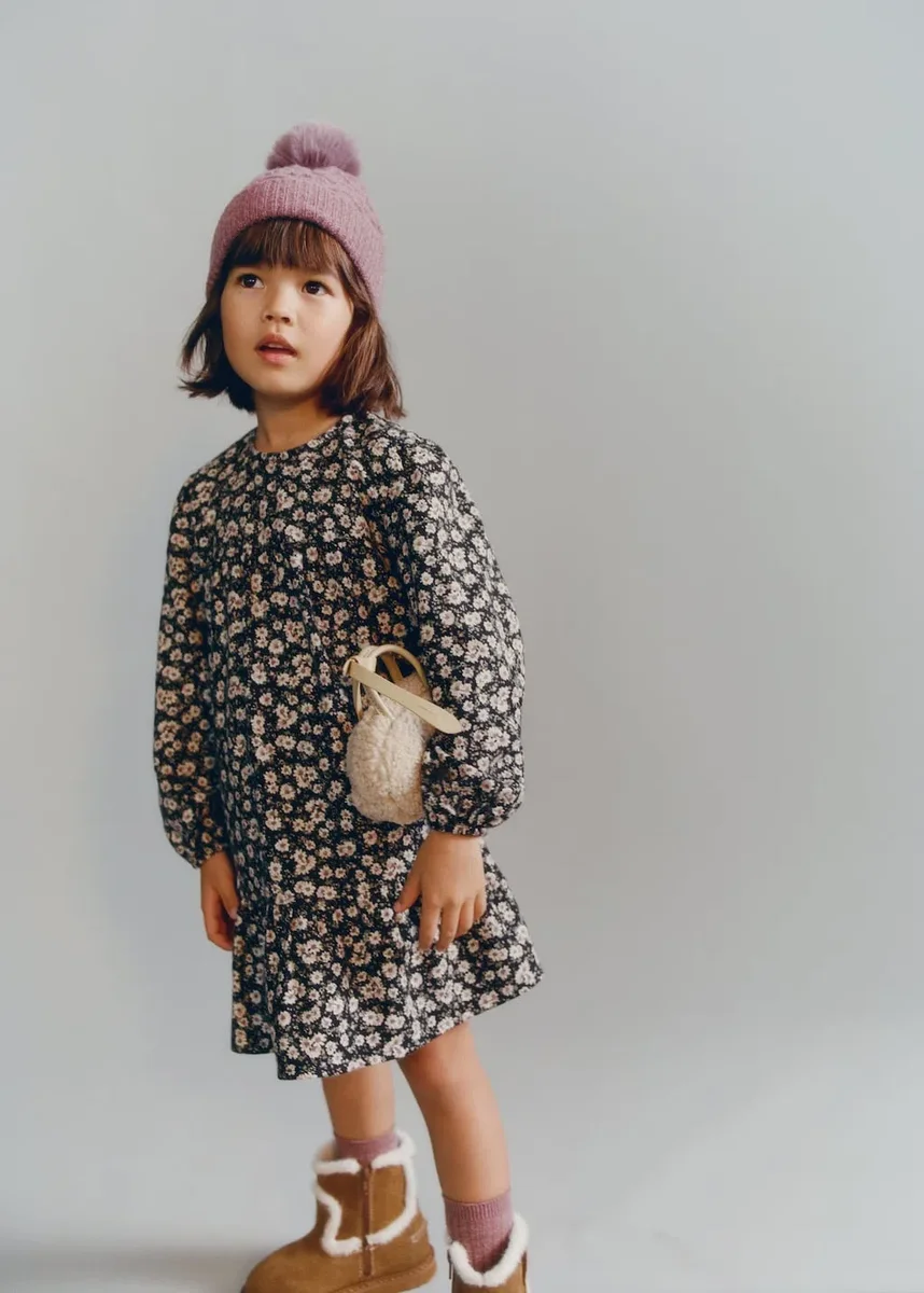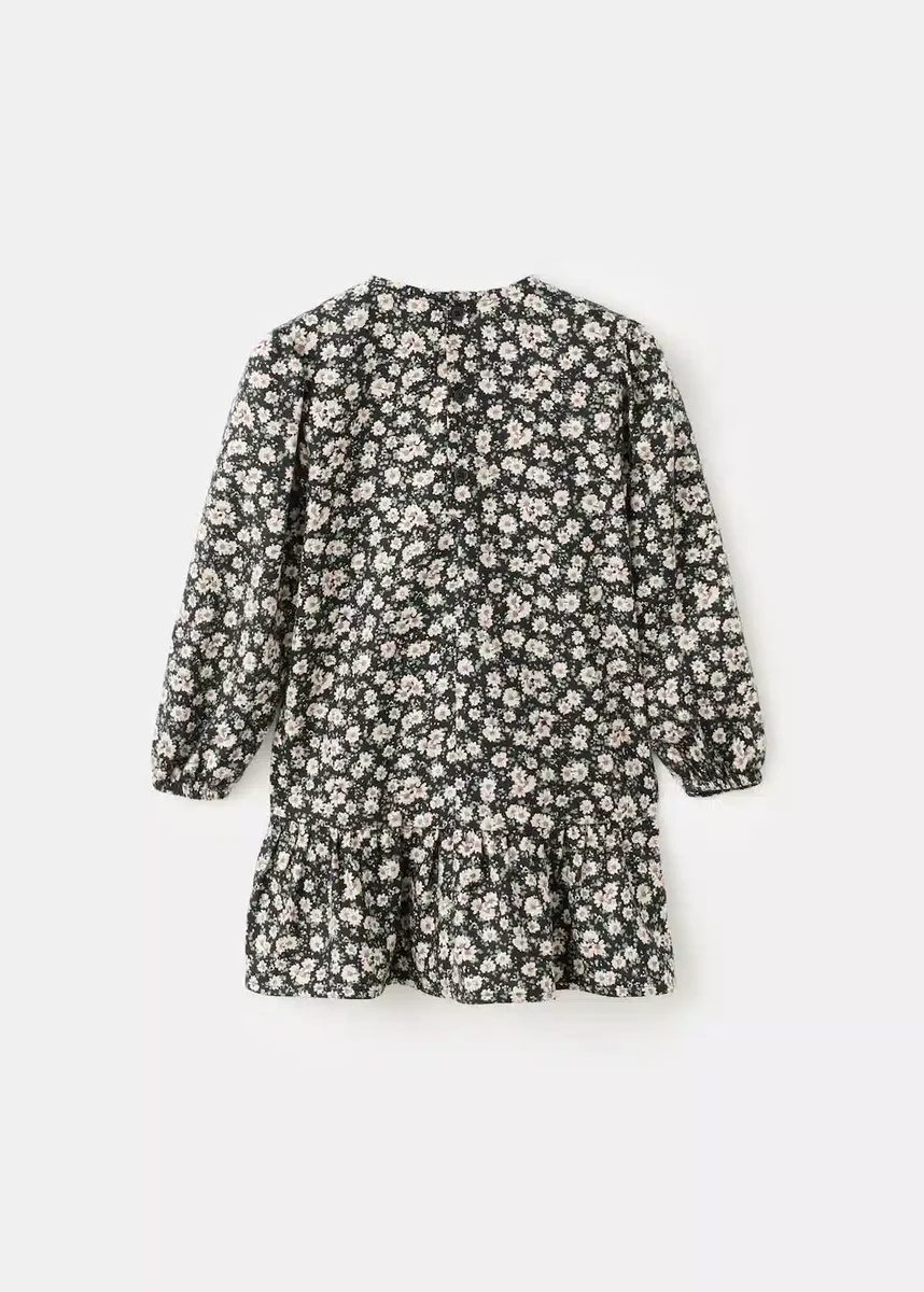 Płynny materiał. Krótki fason. Fason w kształcie litery A. Okrągły dekolt. Długie rękawy z elastycznymi mankietami. Falbanka u dołu. Czarny piątek