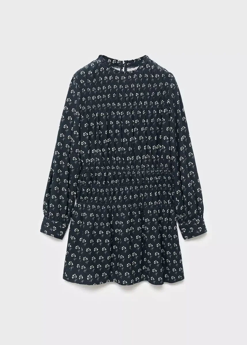 Płynny materiał. Krój w kształcie litery A. Nadrukowany wzór. Kwiatowy wzór. Okrągły dekolt. Długie rękawy. Marszczone detale. Zapięcie na guziki z tyłu. Powrót do szkoły.