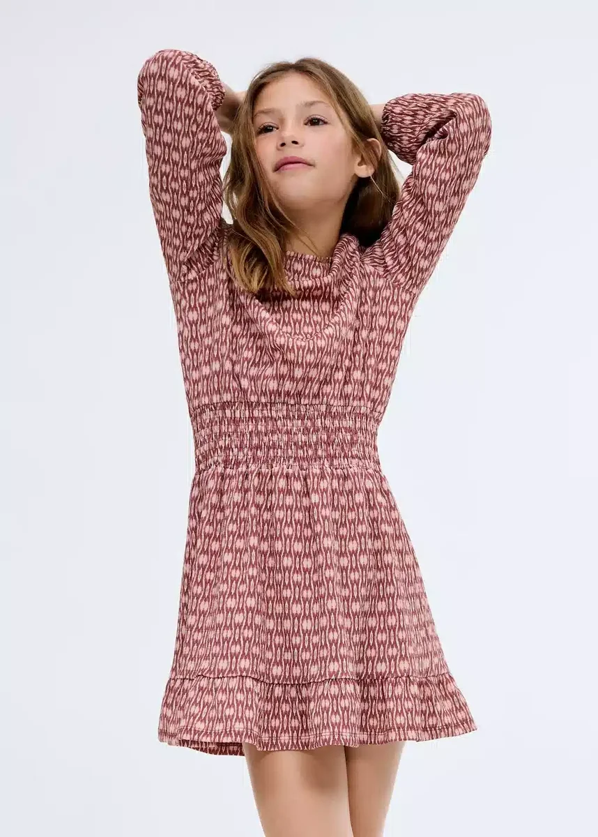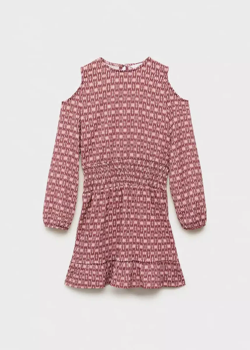 Płynny materiał. Krój w kształcie litery A. Nadrukowany wzór. Okrągły dekolt. Zapięcie na guziki z tyłu. Długie rękawy. Wycięcia na ramionach. Marszczona wstawka w talii. Falbanka na dole. Czarny piątek