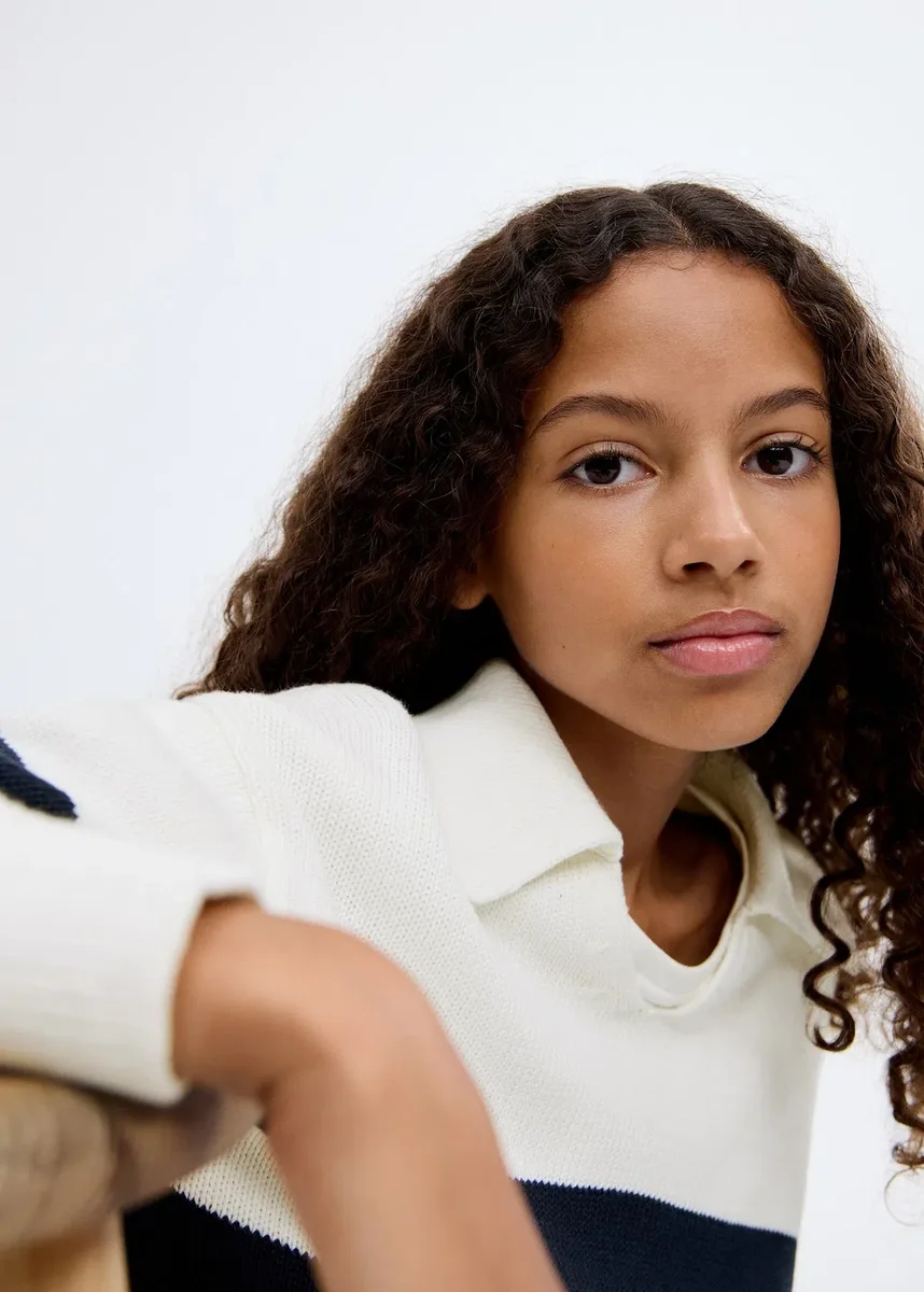 Dzianina. Materiał w paski. Prosty krój. Kołnierzyk polo. Długi rękaw. Ściągacz przy szyi, mankietach i u dołu.
