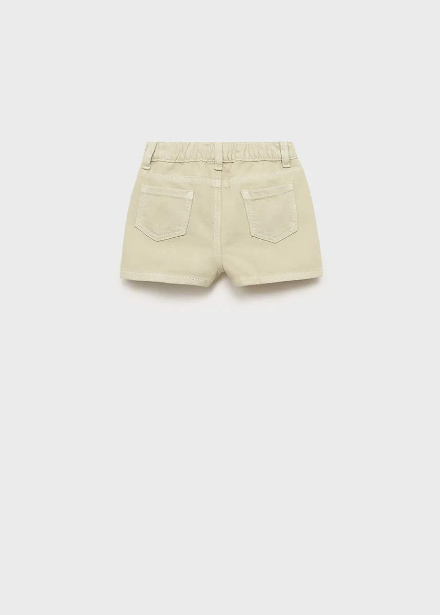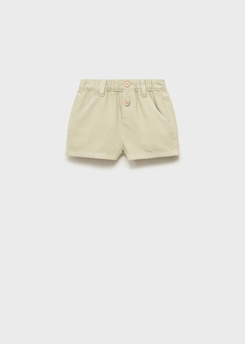 100% bawełna. Krótki krój. Szlufki. Elastyczny pas. Sznurek w pasie. Ozdobne guziki. Naszywane kieszenie z tyłu.