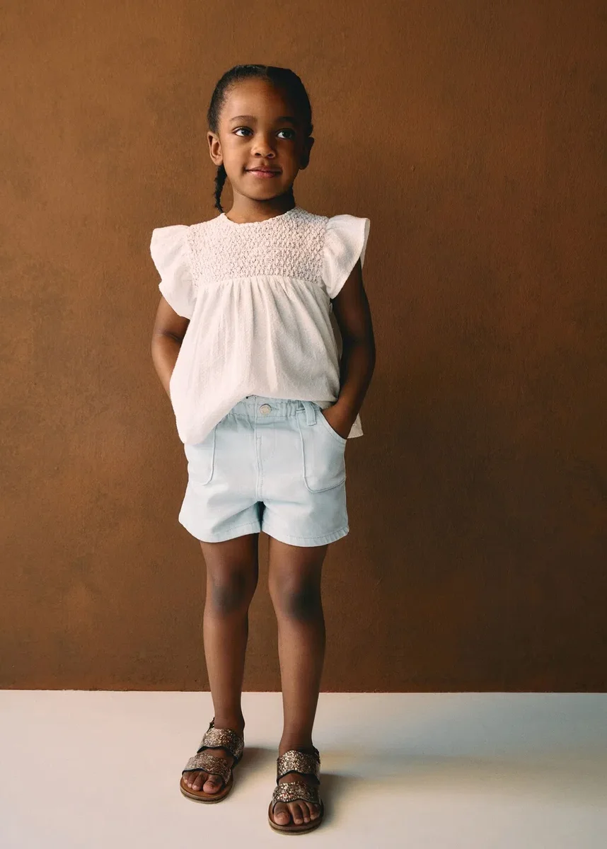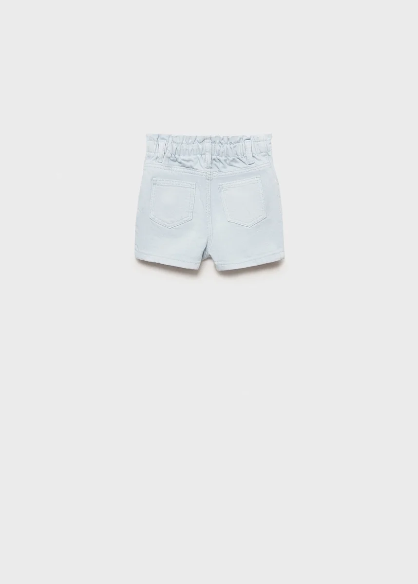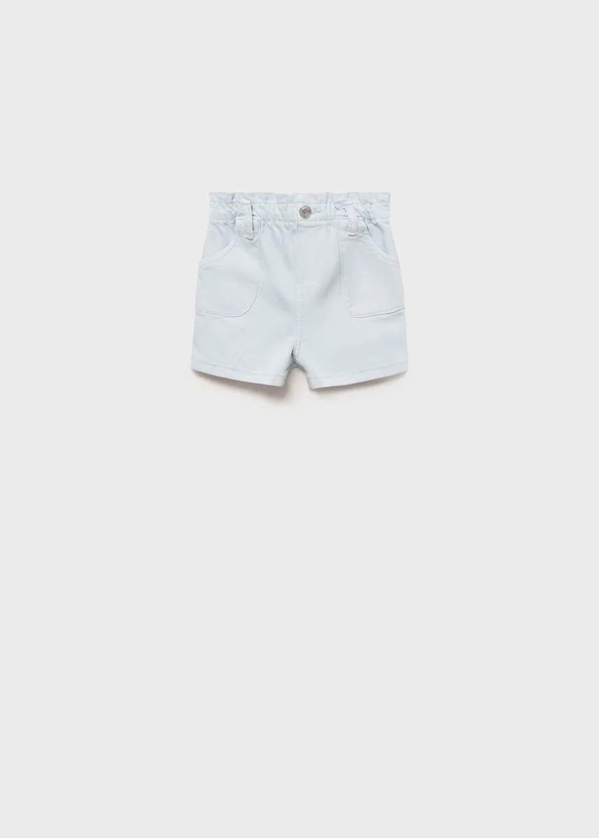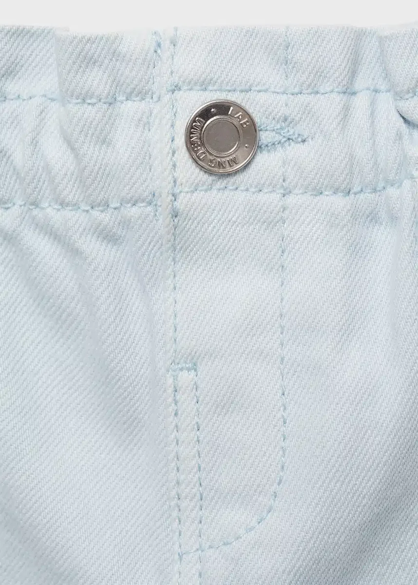 Bawełniany dżins. Prosty krój. Krótki fason. Szlufki. Dwie kieszenie boczne. Dwie naszywane kieszenie z tyłu. Zapięcie na jeden zatrzask. Elastyczny pas typu paperbag.