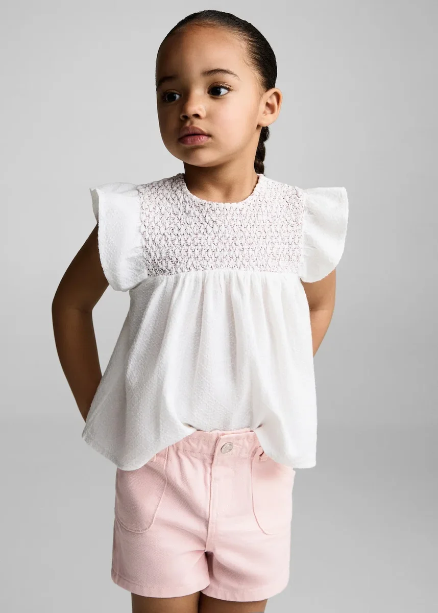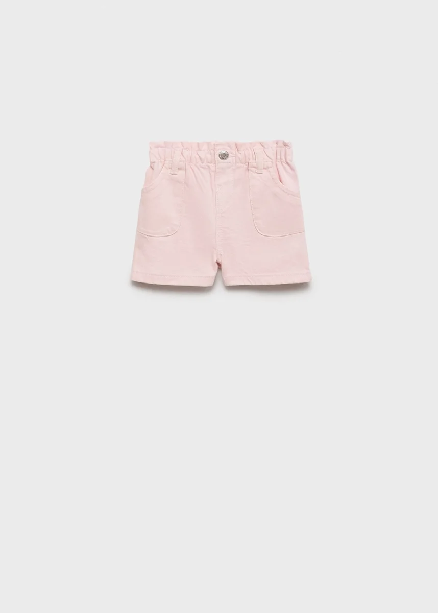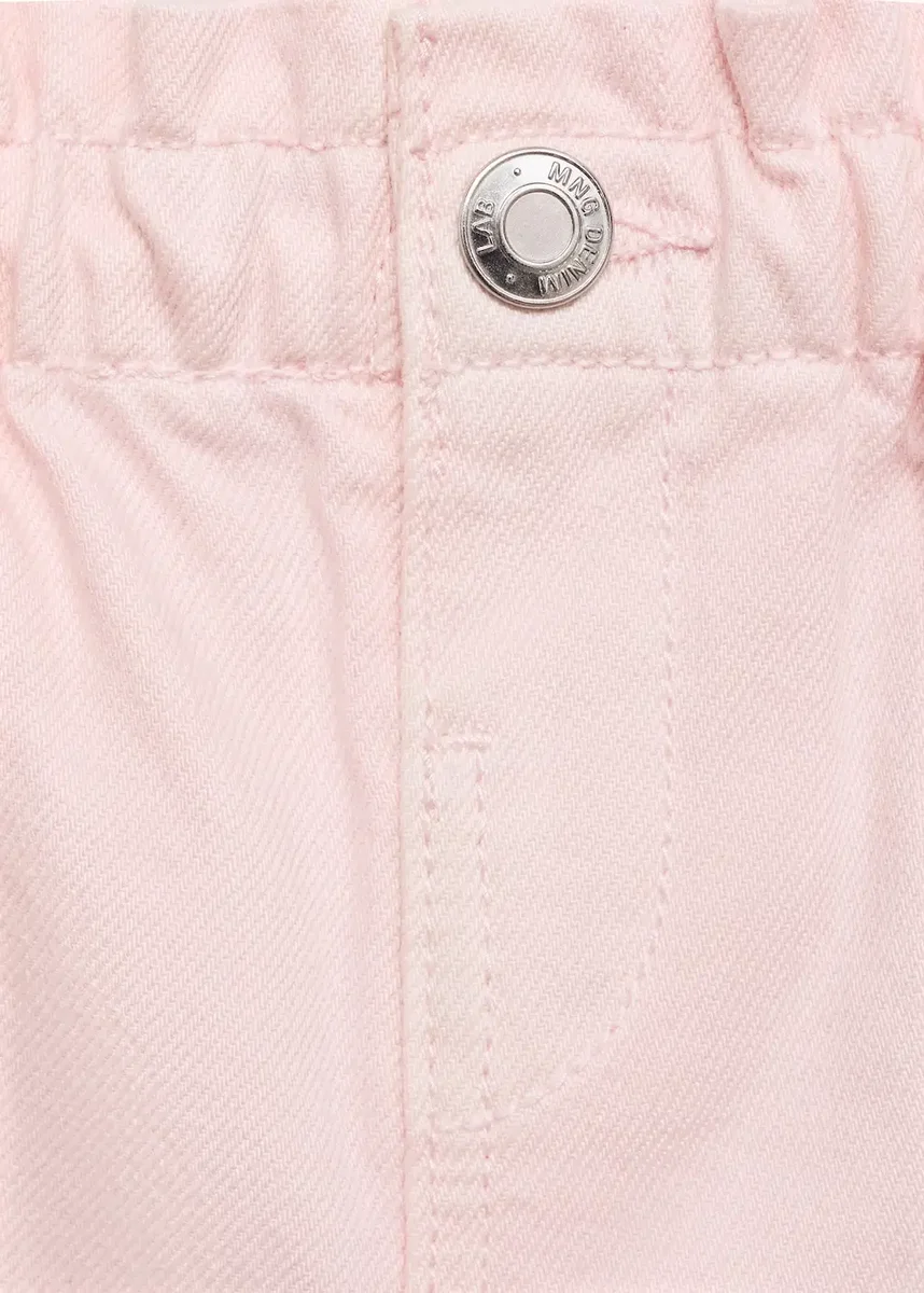 Bawełniany dżins. Prosty krój. Krótki fason. Szlufki. Dwie kieszenie boczne. Dwie naszywane kieszenie z tyłu. Zapięcie na jeden zatrzask. Elastyczny pas typu paperbag.