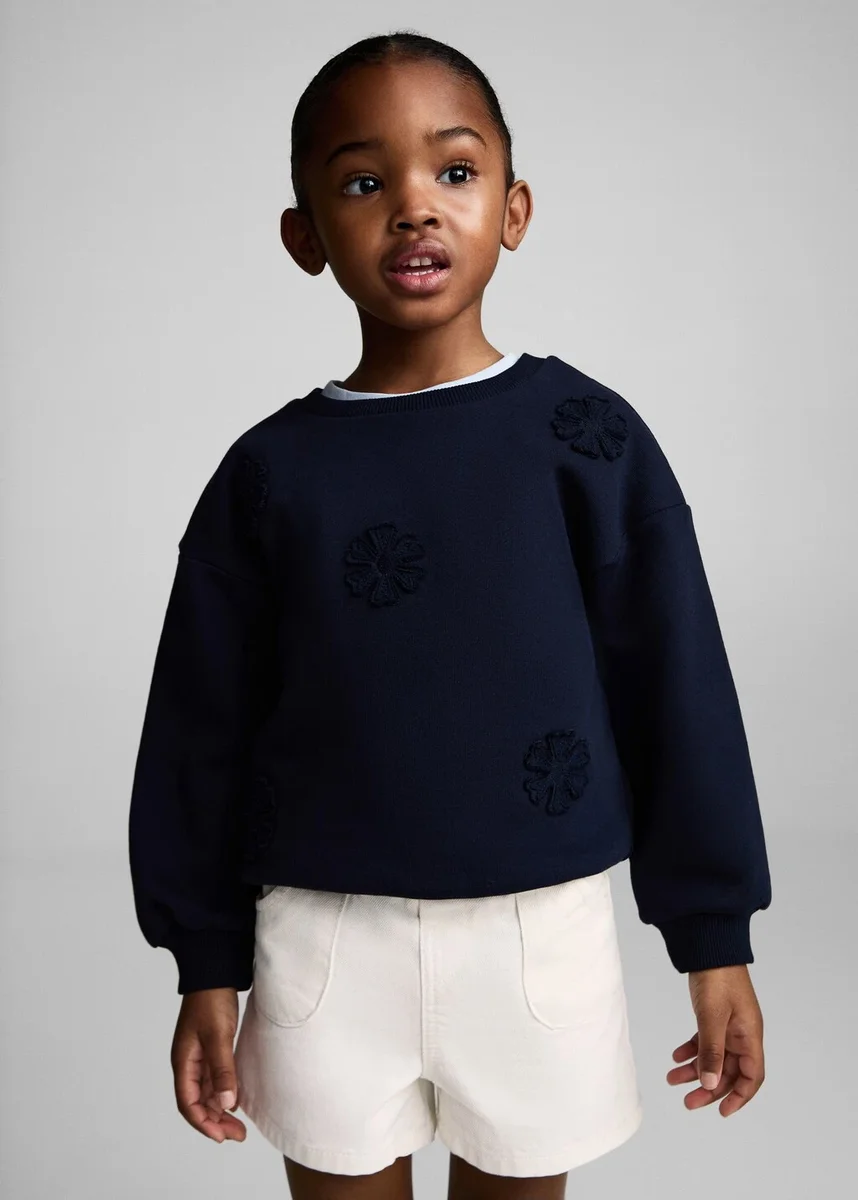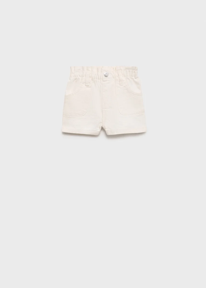 Bawełniany dżins. Prosty krój. Krótki fason. Szlufki. Dwie kieszenie boczne. Dwie naszywane kieszenie z tyłu. Zapięcie na jeden zatrzask. Elastyczny pas typu paperbag.