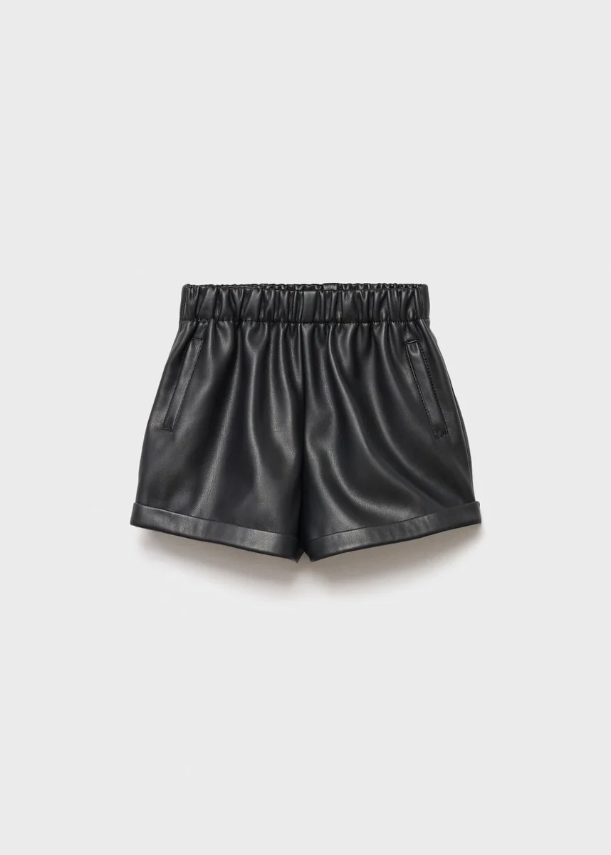 Wykonane z tkaniny imitującej skórę, te szorty mają regulowany elastyczny pas i marszczony panel. Posiadają dwie kieszenie boczne dla większej funkcjonalności.