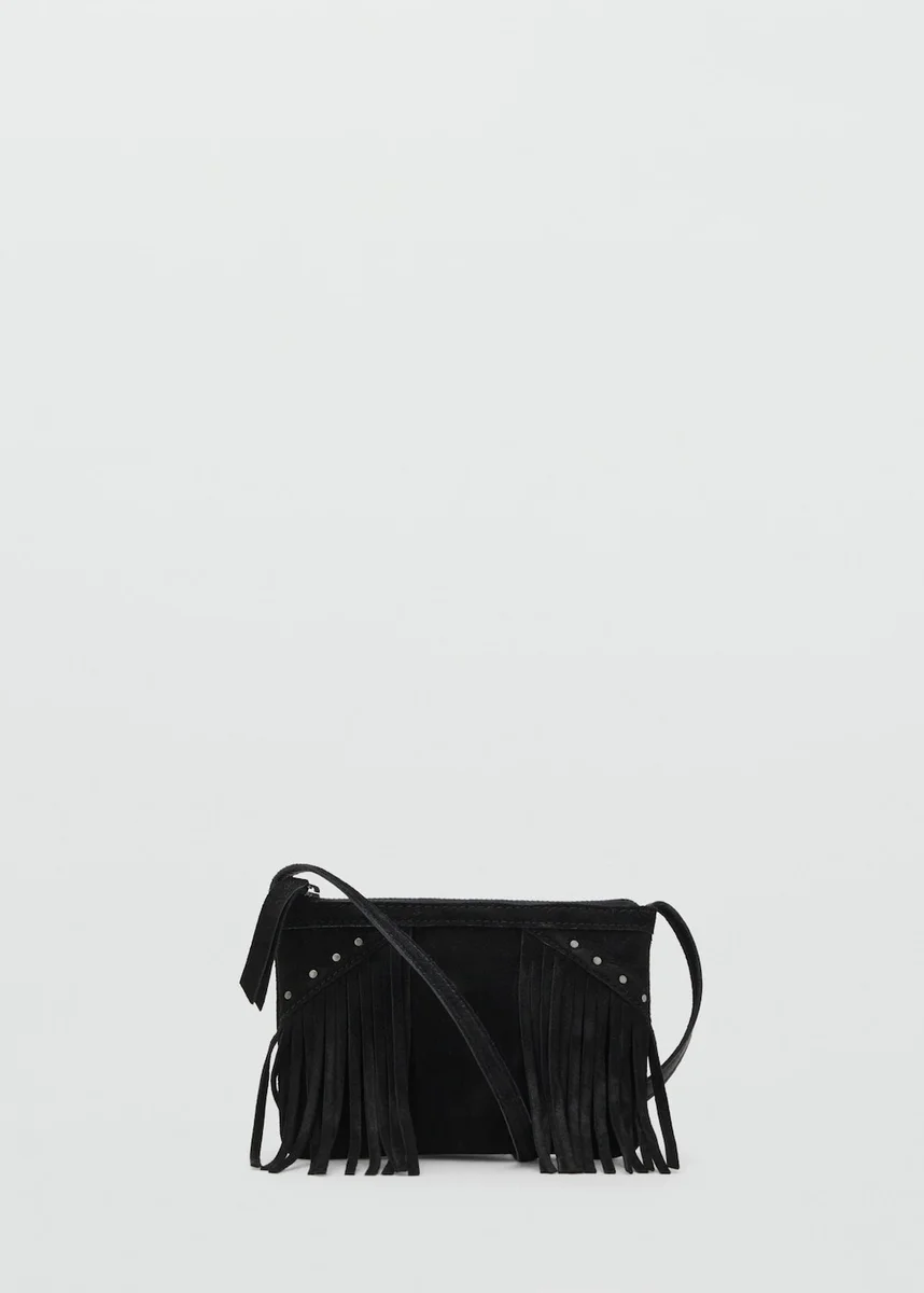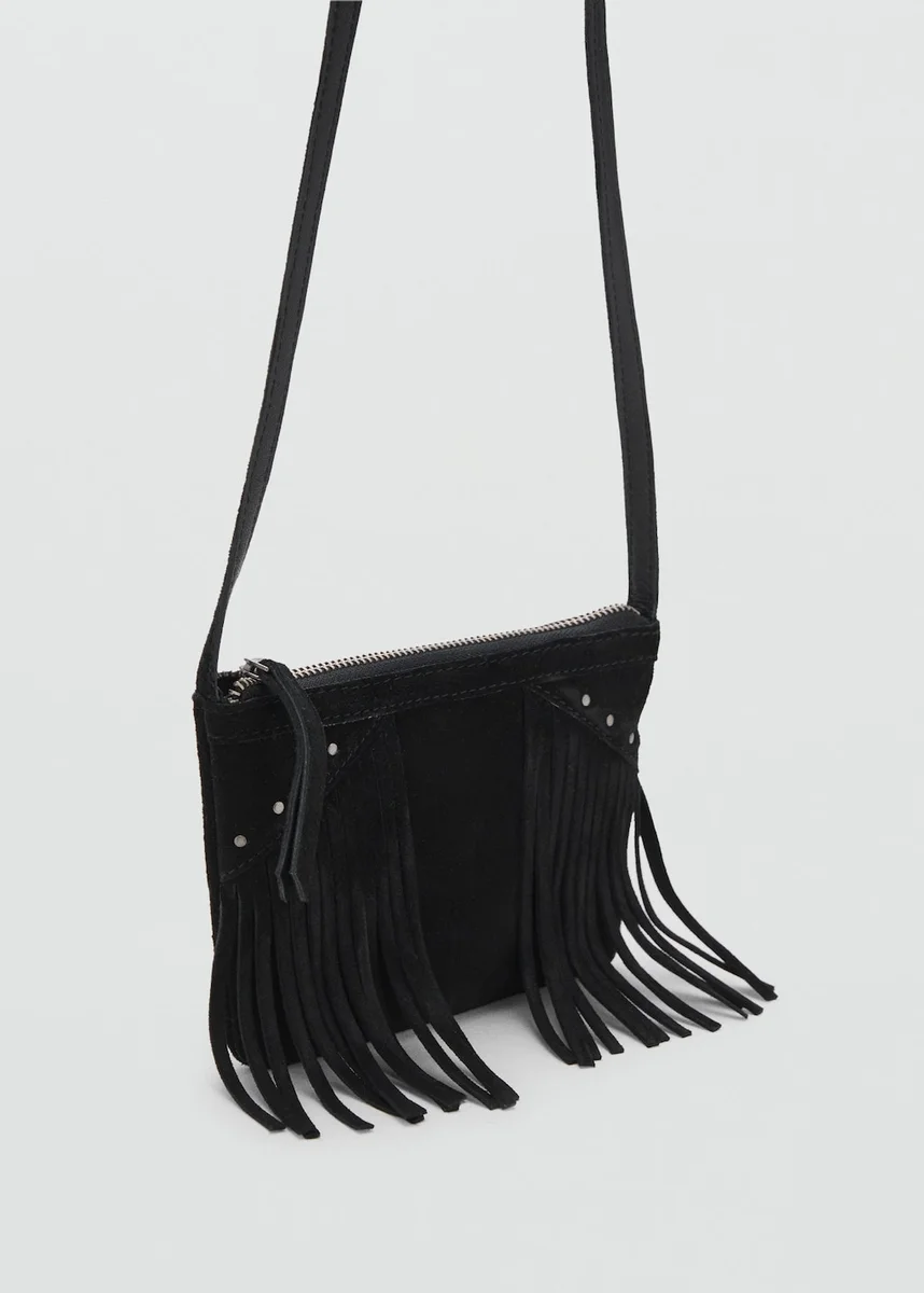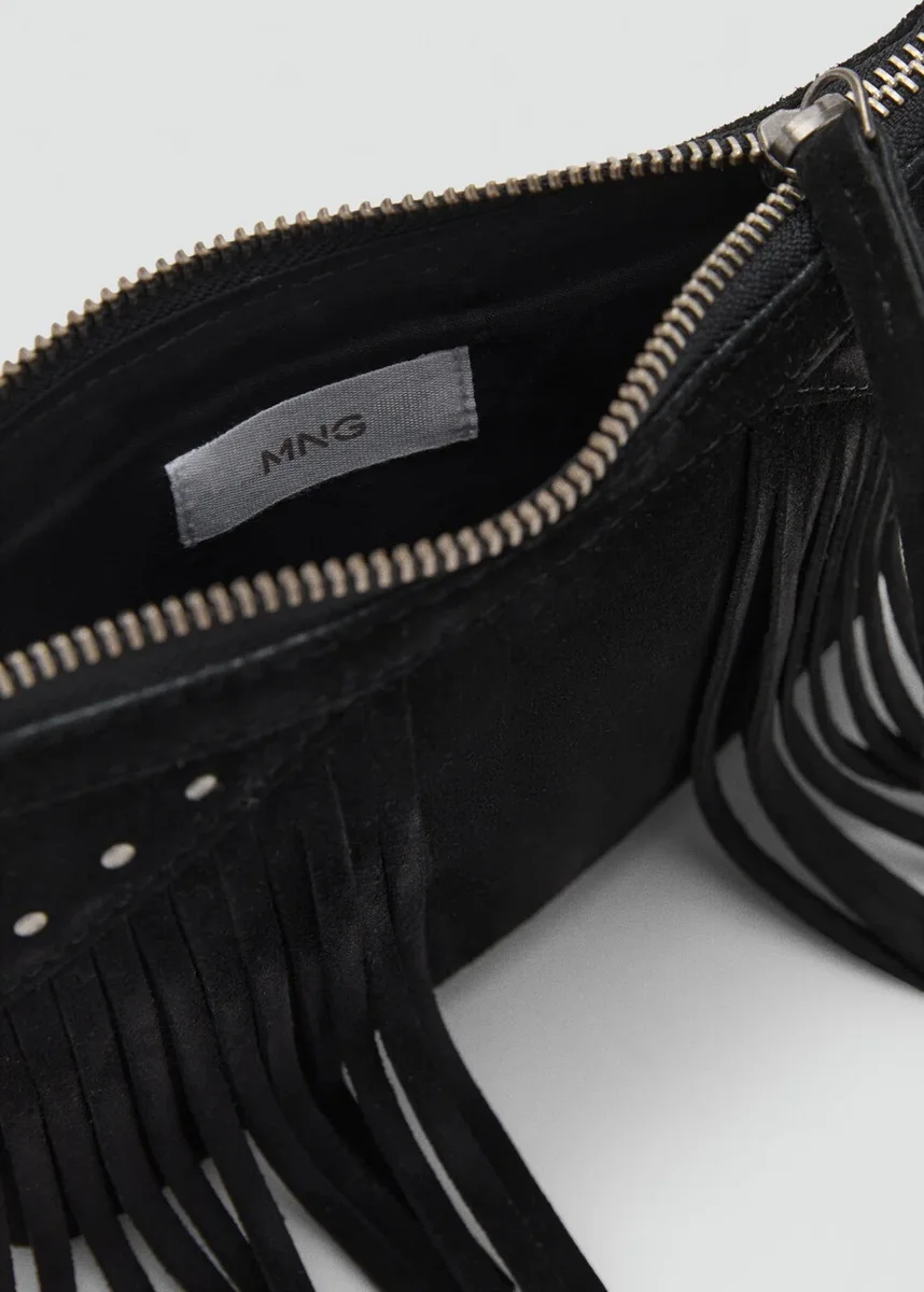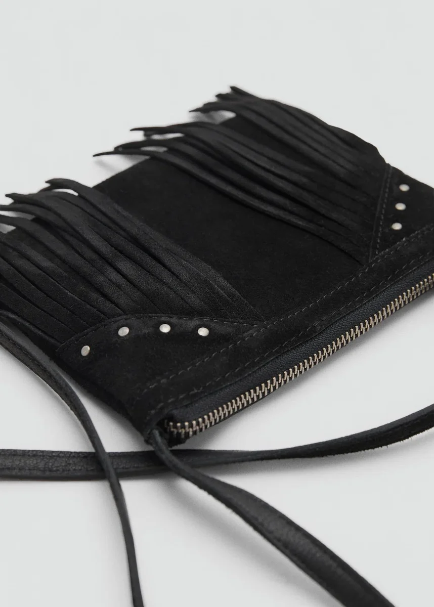 100% skóra bydlęca. Prostokątny kształt. Frędzle. Zapięcie na zamek błyskawiczny. Ozdobione ćwiekami. Długi uchwyt. 7,09 x 5,12 x 0,39 cala (długość x wysokość x szerokość)