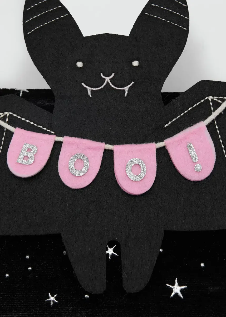 Aksamitna tkanina. Motyw nietoperza. Detale w kształcie gwiazdy i księżyca. Kolekcja Halloween. Czarny piątek. 7,48 x 5,12 x 3,15 cala (długość x wysokość x szerokość)