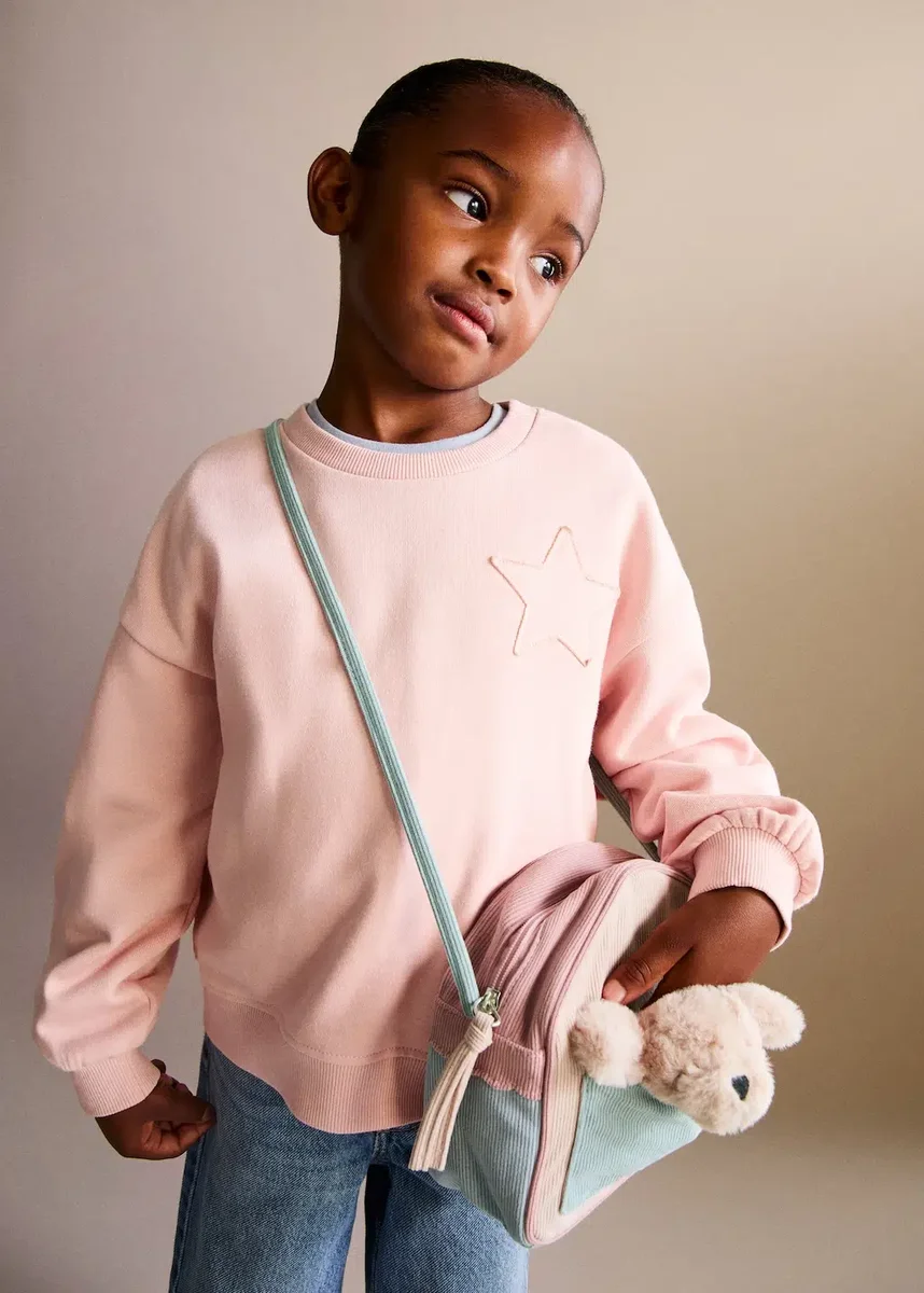 Tkanina sztruksowa. Krój domowy. Długie uchwyty. Zapięcie na zamek błyskawiczny. Pluszowa zabawka w kształcie psa.