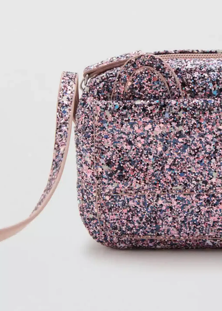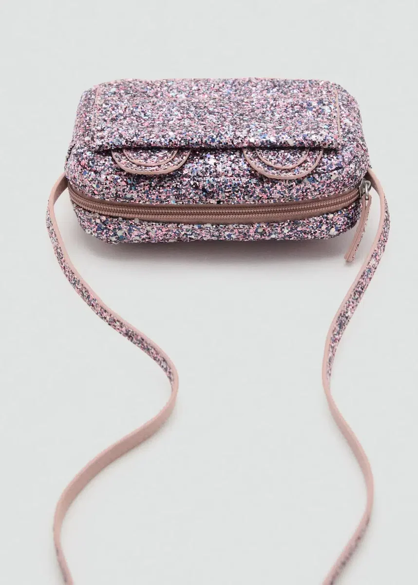 Wzór uszu. Różowy brokat. Zapięcie na zamek błyskawiczny. Długi uchwyt. Przednia naszywana kieszeń.