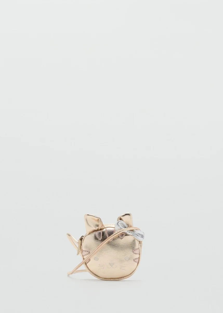 Metaliczna tkanina. Wzór kotka. Ozdobna kokardka. Długi uchwyt. Zapięcie na zamek błyskawiczny.