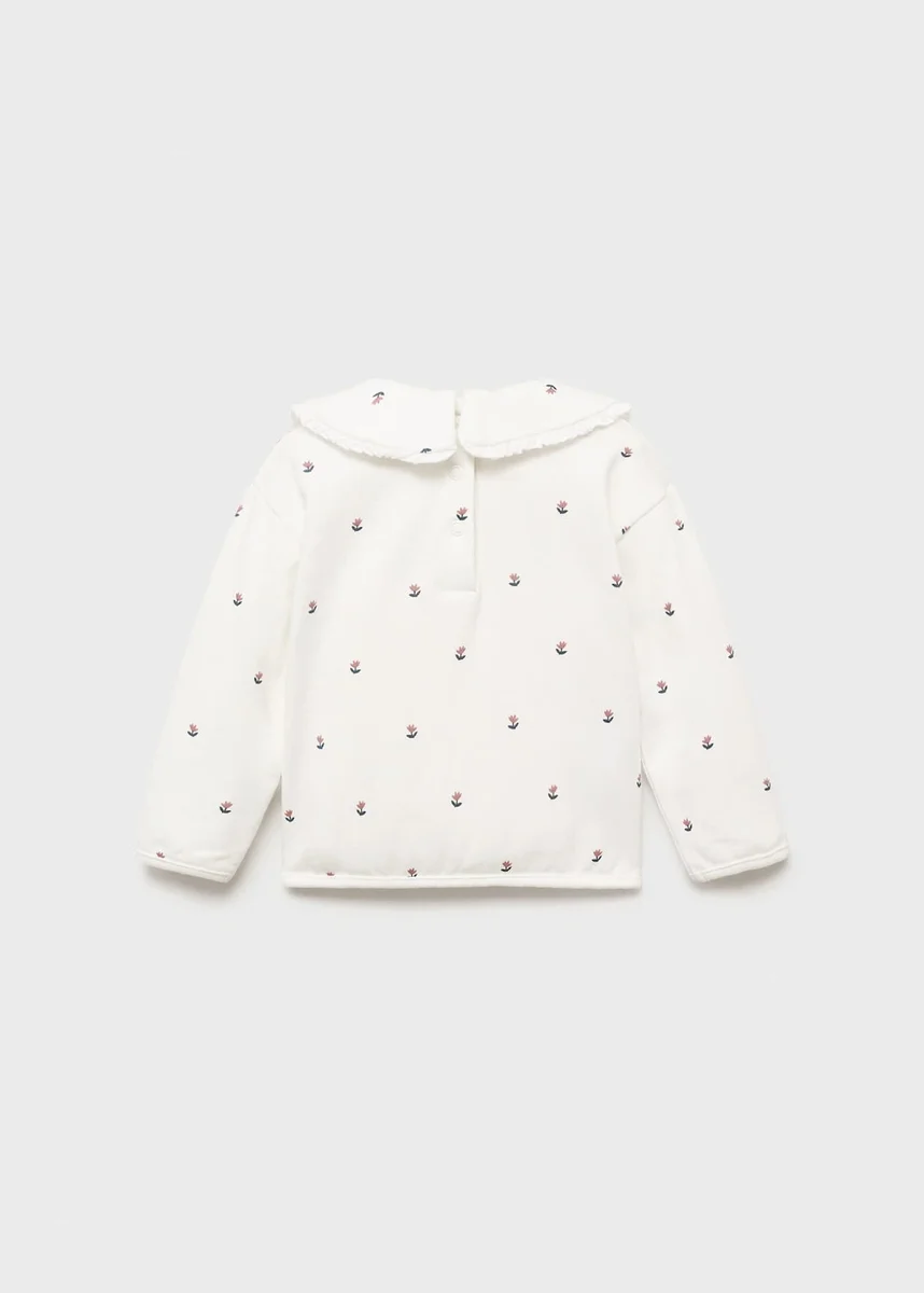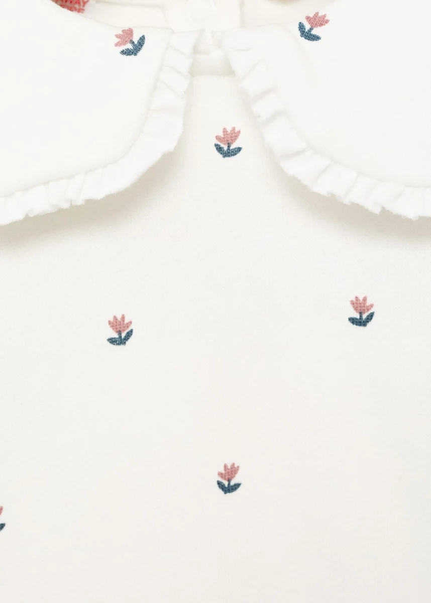 100% bawełna. Prosty krój. Nadrukowany wzór. Kwiatowy nadruk. Kołnierzyk babydoll. Długie rękawy. Ukryte zapięcie na guziki z tyłu.