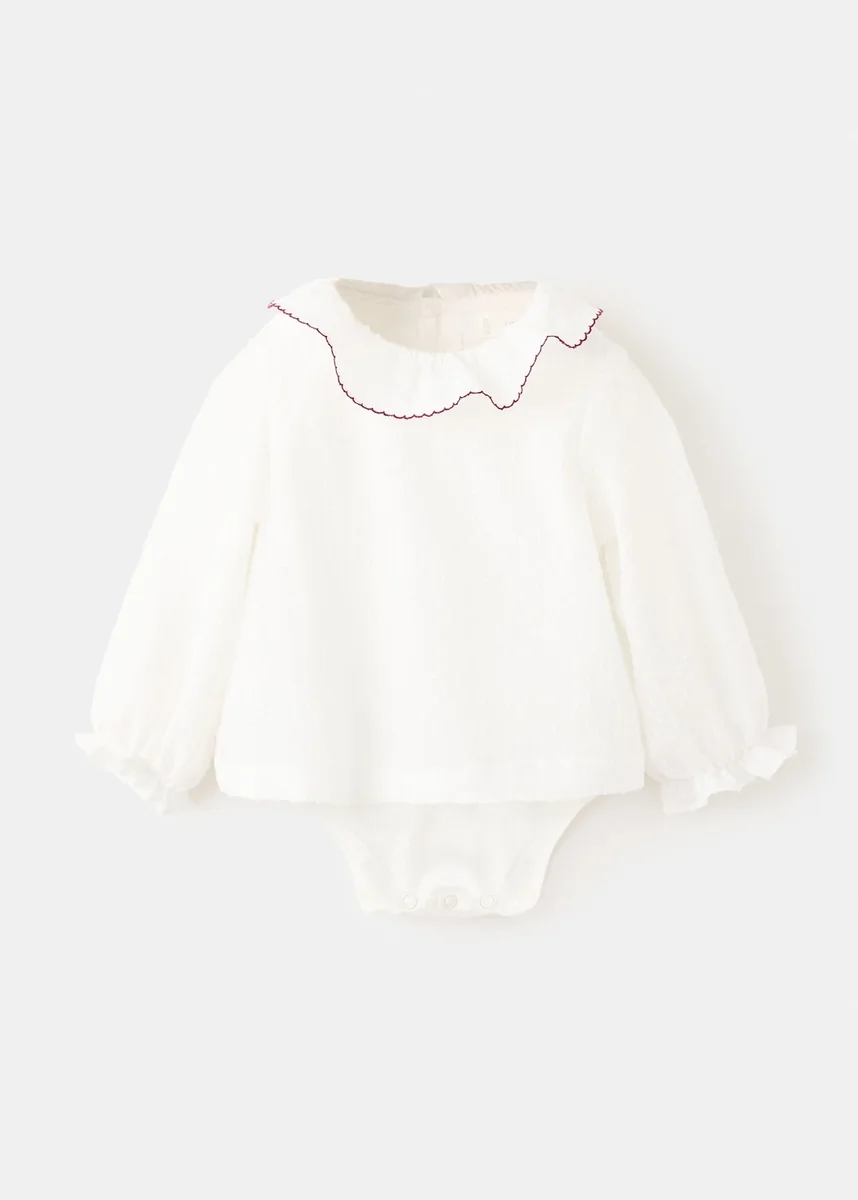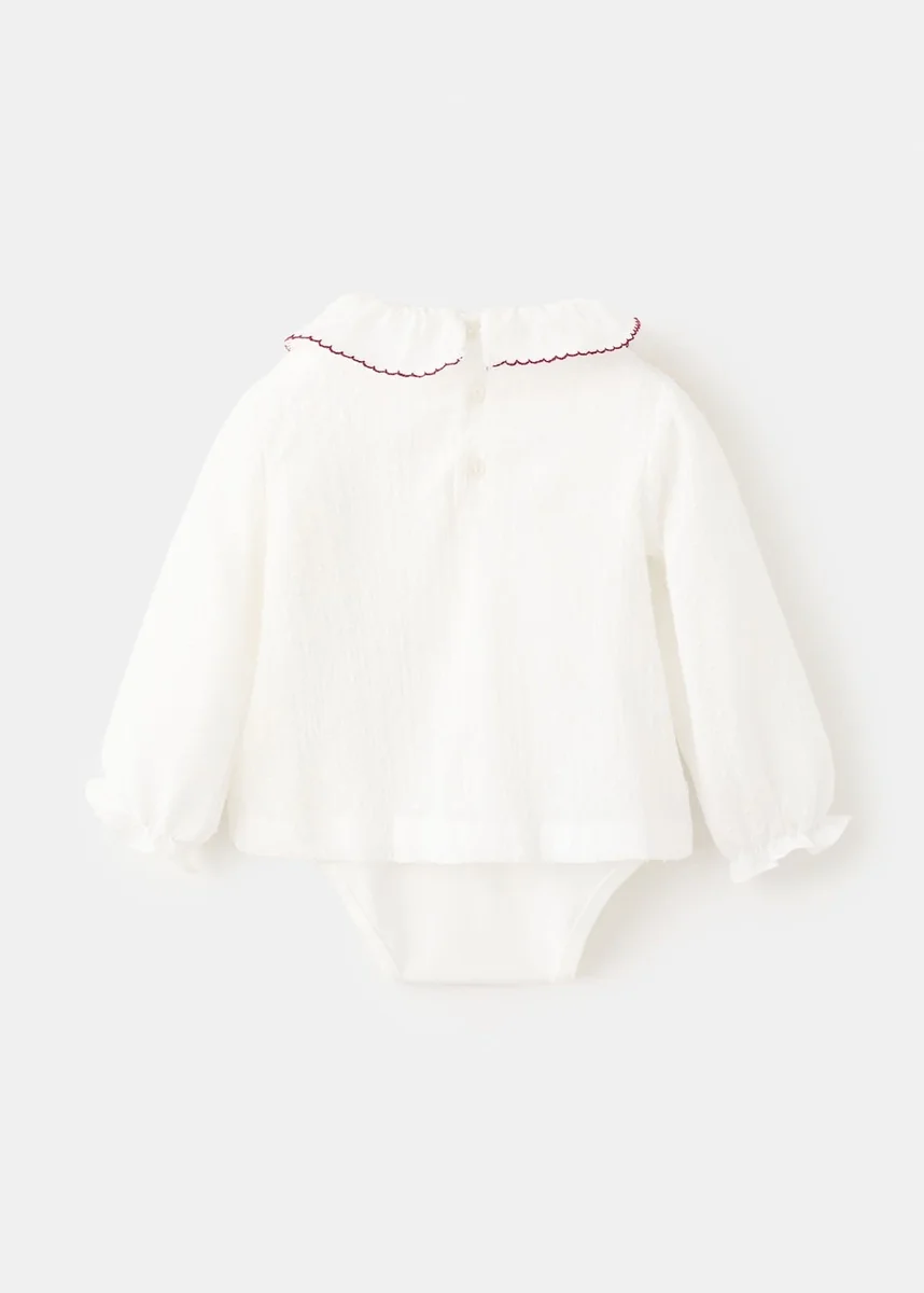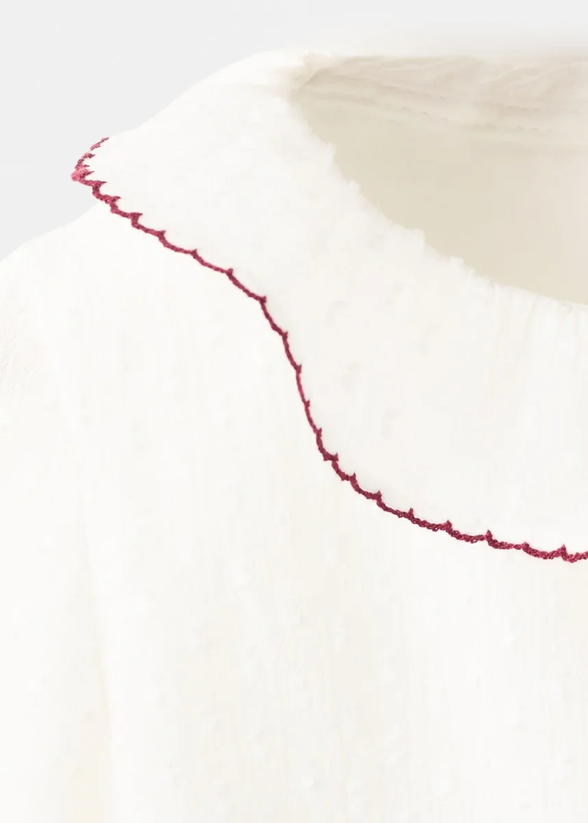 100% bawełna. Dopasowany krój. Haftowany wzór. Kołnierzyk typu Peter Pan. Haftowane wykończenie dekoltu. Długie rękawy z prążkowanymi wykończeniami. Zapięcie na guziki z tyłu. Otwór u dołu z zapięciem na guziki. Kolekcja świąteczna.