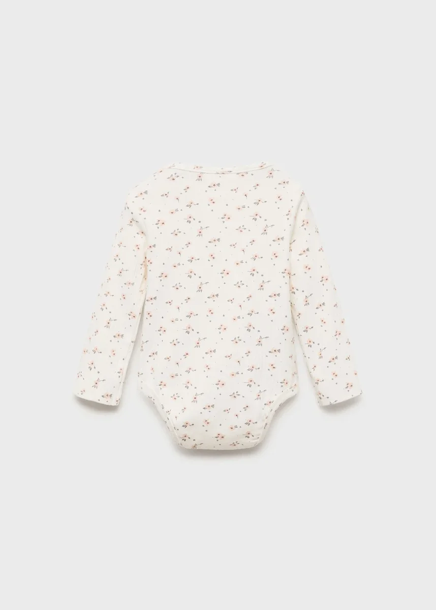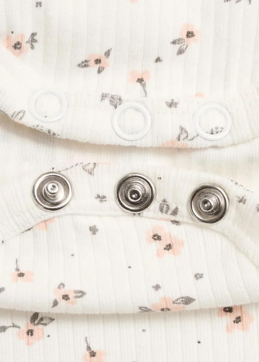 Dzianina prążkowana. Tkanina bawełniana. Tkanina elastyczna. Kwiatowy nadruk. Prosty krój. Okrągły dekolt. Długie rękawy. Zapięcie na guziki przy szyi. Zapięcie na guziki u dołu.