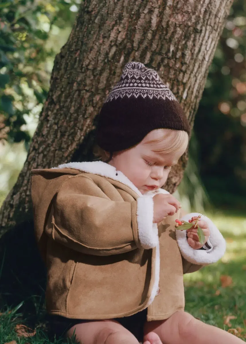 Sztuczna zamszowa tkanina. Wnętrze ze sztucznej owczej skóry. Dwustronny wzór. Z kapturem. Zapięcie na guziki z przodu. Kolekcja świąteczna.