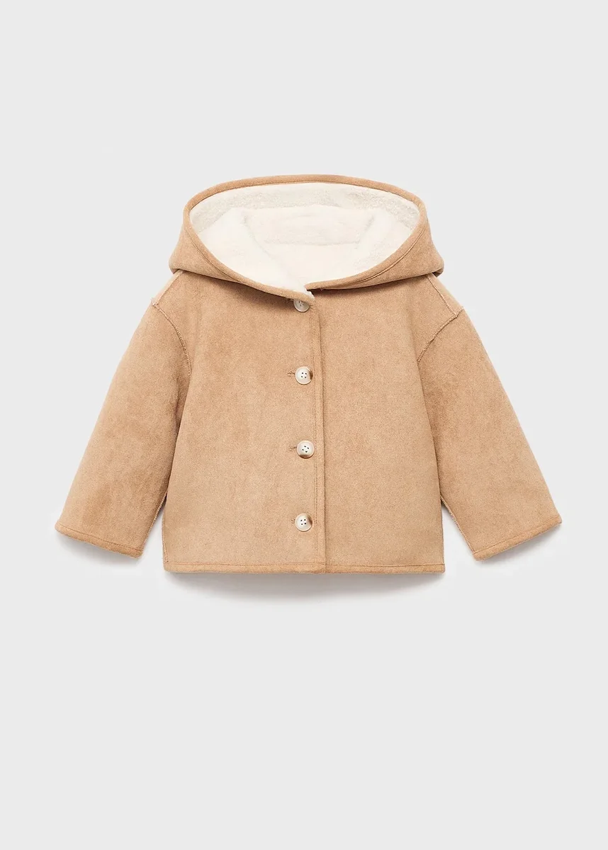 Sztuczna zamszowa tkanina. Wnętrze ze sztucznej owczej skóry. Dwustronny design. Z kapturem. Zapięcie na guziki z przodu. Kolekcja świąteczna