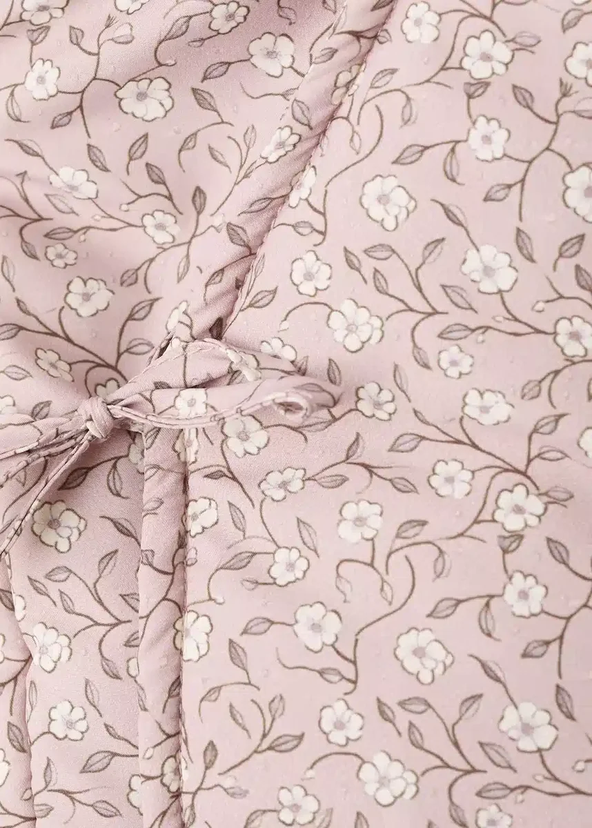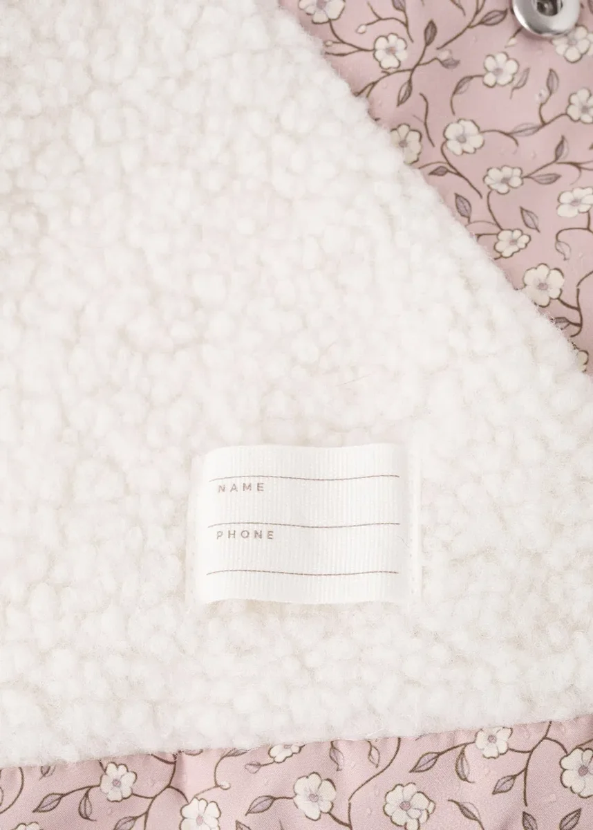 Pikowana tkanina. Wnętrze z imitacji owczej skóry. Kwiatowy wzór. Zapięcie na skrzyżowane kokardki. Z kapturem. Długi rękaw