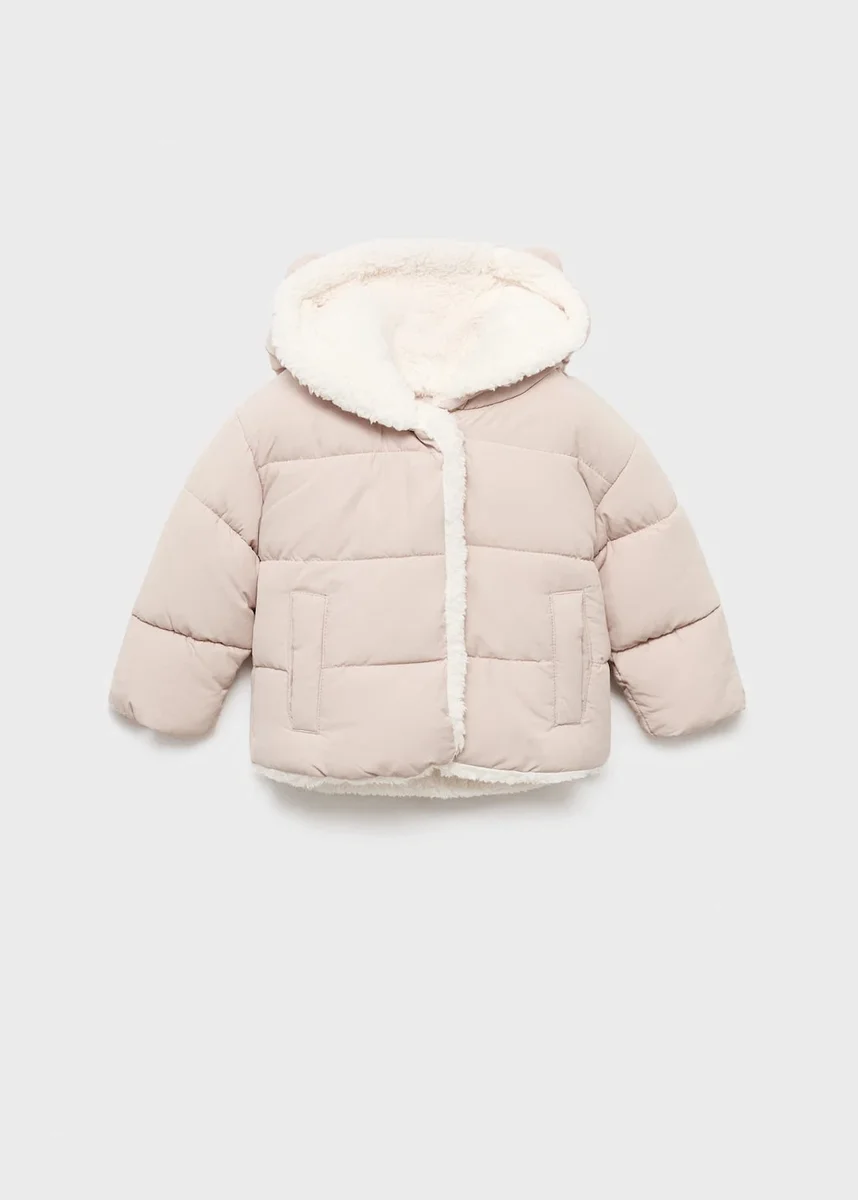 Pikowana tkanina. Podszewka z efektem futra. Kopertowy krój. Małe uszka na kapturze. Zapięcie na zatrzaski krzyżowe