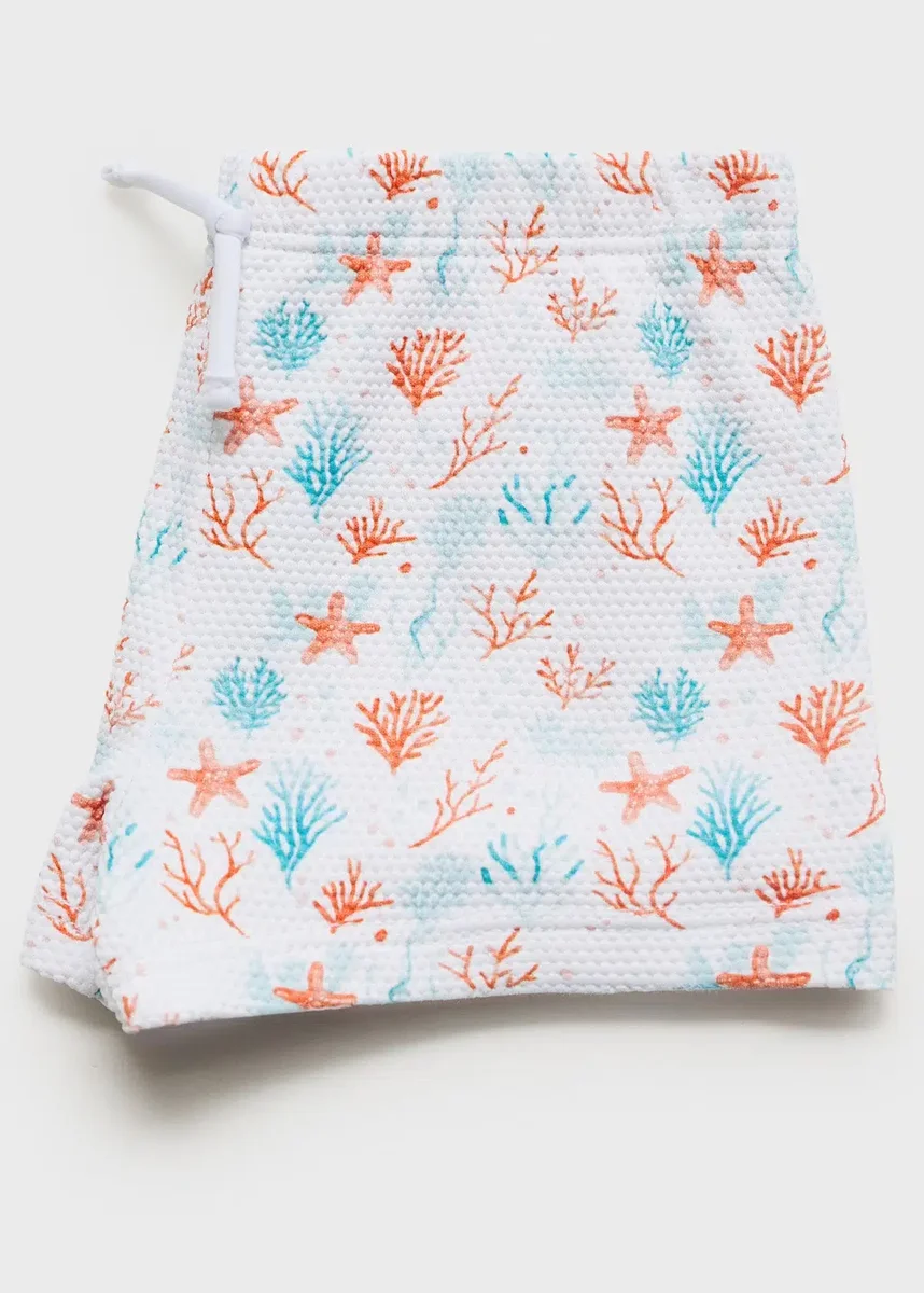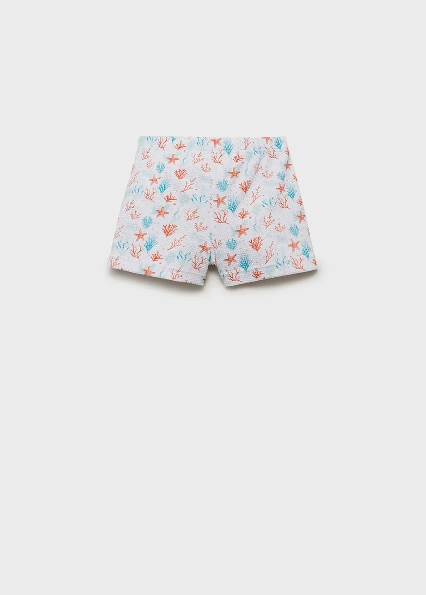 Teksturowana tkanina. Prosty krój. Krótki fason. Nadrukowany wzór. Morski nadruk. Elastyczny pas z sznurkiem. Podszewka wewnętrzna. Produkt promocyjny.
