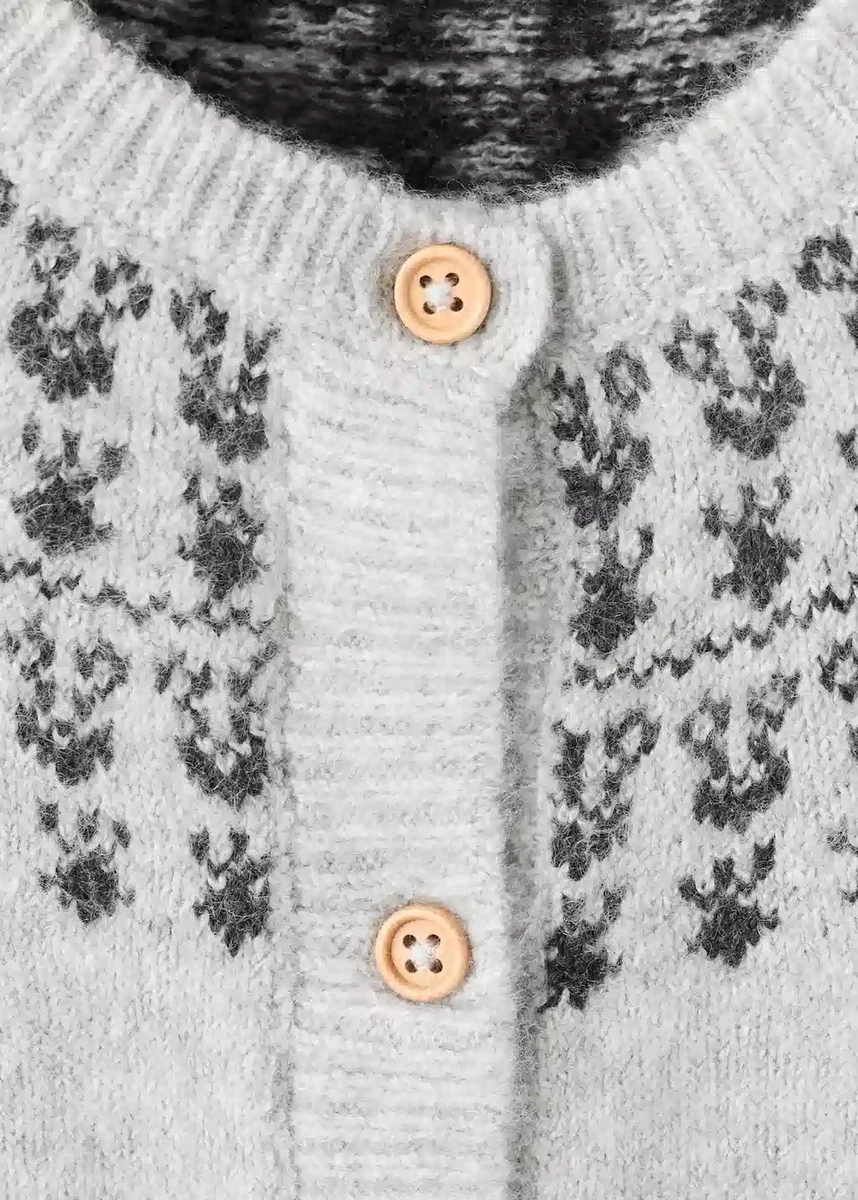 Dzianina. Prosty krój. Haftowane wykończenie. Okrągły dekolt. Długie rękawy. Zapięcie na guziki z przodu. Kolekcja świąteczna