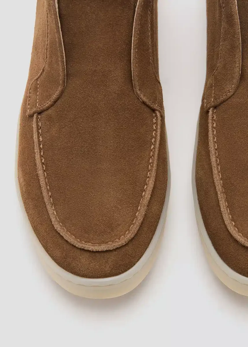 100% zamsz. Gumowa podeszwa. Detale z tylnym szwem. Zaokrąglony nosek. Bez sznurowadeł