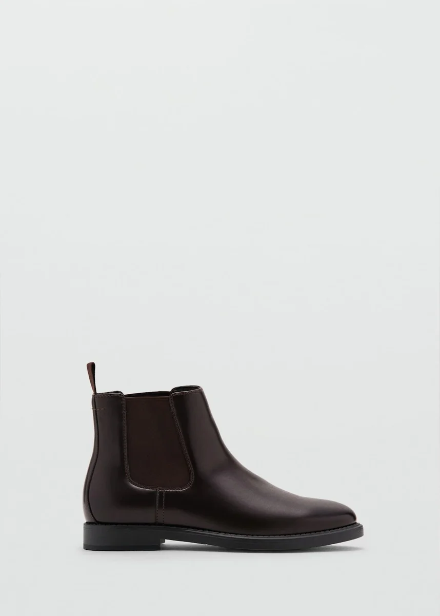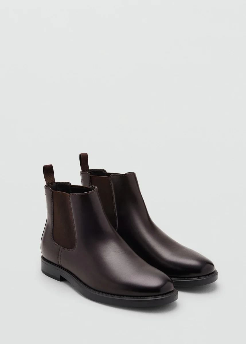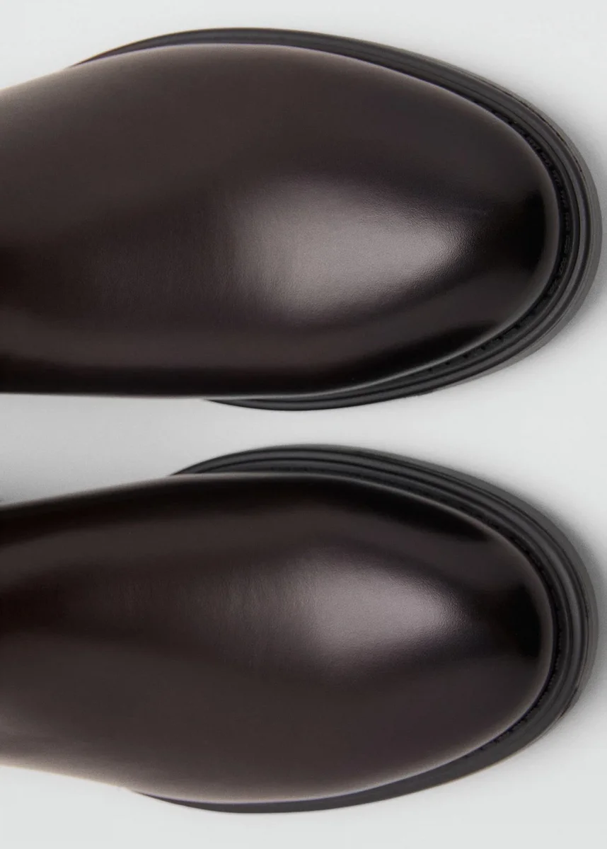 Efekt skóry. Błyszczące wykończenie. Model Chelsea. Kontrastujące elastyczne panele. Okrągły nosek. Pętelka z tyłu