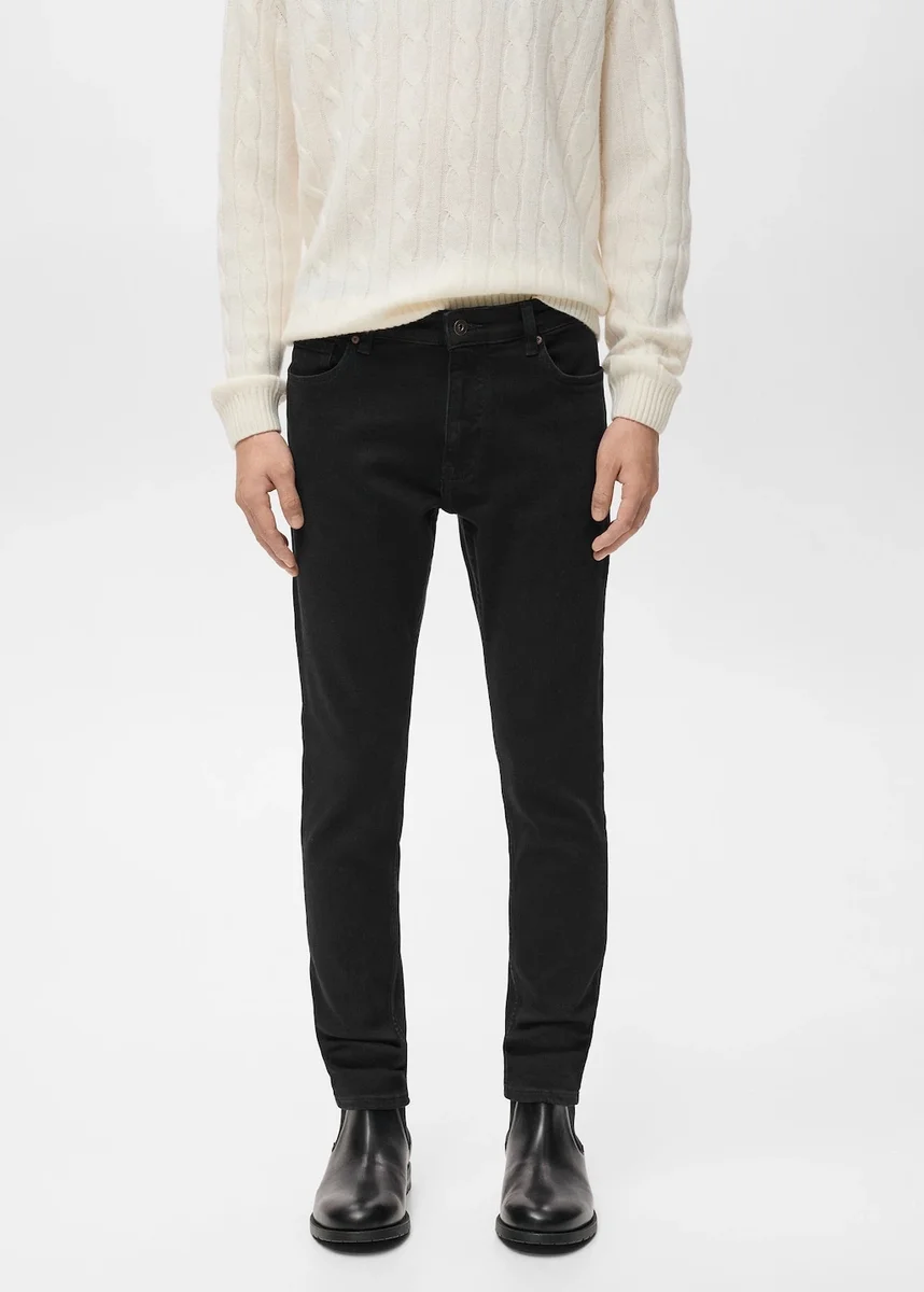 Tkanina bawełniana. Kolor czarny. Szlufki. Zapięcie na zamek błyskawiczny i guzik. Dwie kieszenie boczne. Kieszeń na monety. Dwie naszywane kieszenie z tyłu. Styl dżinsowy. Skinny fit: najwęższe dopasowanie dżinsów.