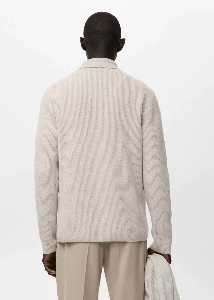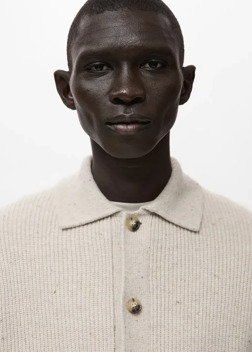 Wyłącznie w sprzedaży internetowej. Dzianina z domieszką wełny. Prążkowany wzór. Regularny krój. Kołnierzyk polo. Długi rękaw. Zapięcie na guziki z przodu.