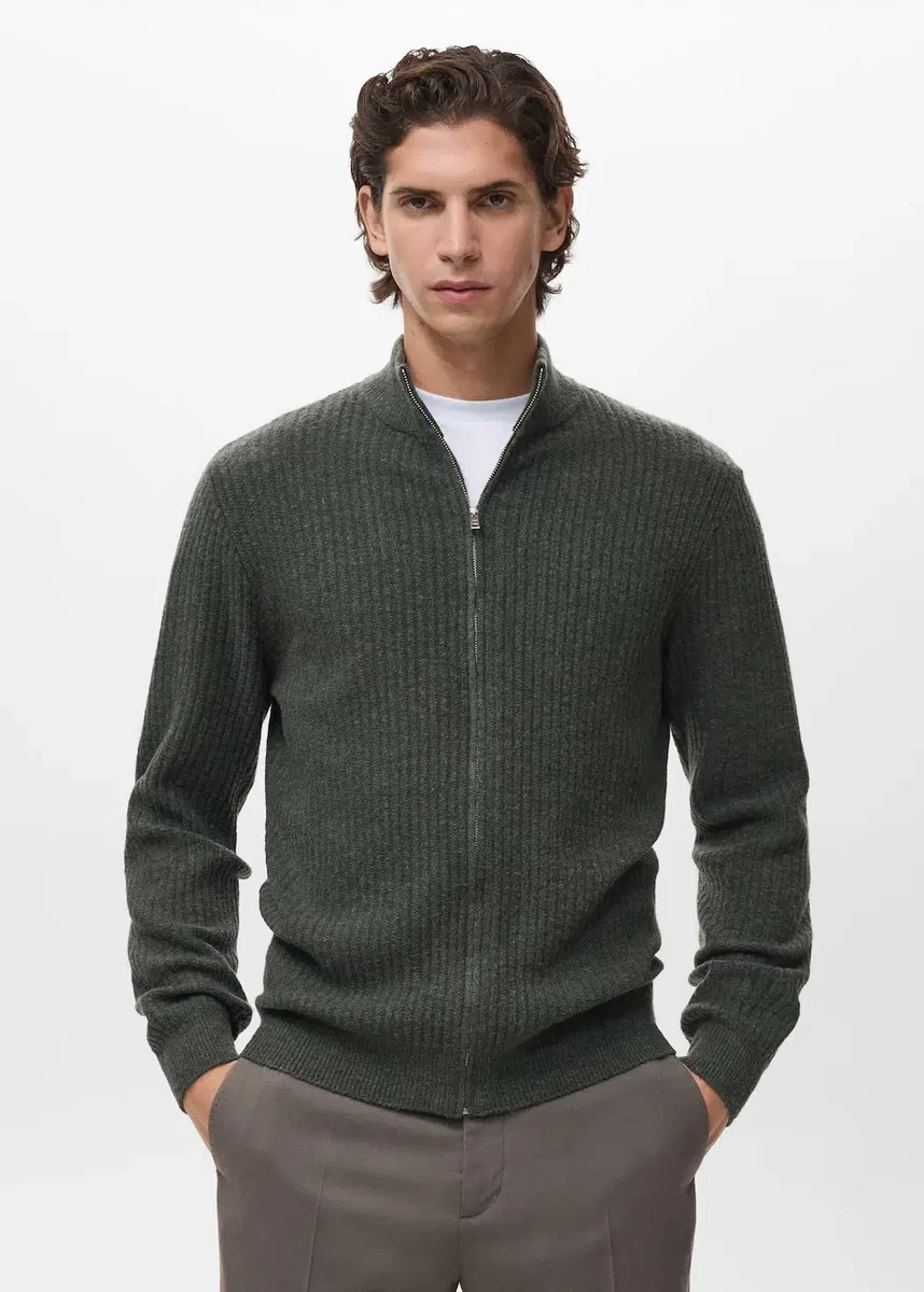 Prosty krój. Dzianina. Dzianina warkoczowa. Stójka. Długie rękawy z elastycznymi mankietami. Ściągacz na rękawach i u dołu. Zapięcie na zamek błyskawiczny z przodu.